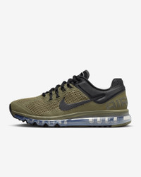 Back and just as stylish as ever. The Air Max 2013 returns with mesh detailing and sporty, no-sew overlays to help keep you looking and feeling fresh. Plus, tried-and-true Flywire lacing and classic full-length Air cushioning provide lasting comfort and support. Benefits - Originally developed for performance running, visible Nike Air cushioning delivers lasting comfort. - Airy mesh details on upper are reinforced with synthetic leather overlays for highly ventilated, classic Nike look. - Foam midsole has flex grooves for a supportive feel that lets you move freely. Product Details - Reflective details - Not intended for use as Personal Protective Equipment (PPE) - Shown: Medium Olive/Metallic Silver/Black - Style: FZ3156-222