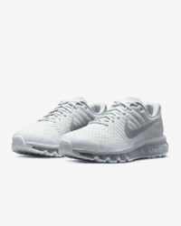 The Nike Air Max 2017 delivers the plush sensation you love with a full-length Max Air unit. The upper is seamlessly constructed with zonal support and ventilation while molded foam wraps your mid-foot and heel for secure comfort. Benefits - Flymesh and synthetic upper provides breathable support. - Full-length Max Air unit delivers enhanced cushioning. - Foam molded into the midfoot wraps the arch for a snug fit. - Sculpted Cushlon midsole combines plush cushioning with springy resilience for impact absorption. Product Details - Not intended for use as Personal Protective Equipment (PPE) - Shown: Pure Platinum/White/Off White/Wolf Grey - Style: 849559-009