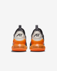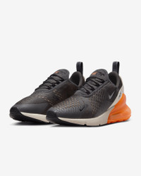 Nike's first lifestyle Air Max brings you style, comfort and big attitude in the Nike Air Max 270. The design draws inspiration from Air Max icons, showcasing Nike's greatest innovation with its large window and fresh array of colors. Benefits - The Max Air 270 unit delivers unrivaled, all-day comfort. - The sleek, running-inspired design roots you to everything Nike. - Woven and synthetic fabric on the upper provides a lightweight fit and airy feel. - Foam midsole feels soft and comfortable. - Stretchy inner sleeve and booty-like construction creates a personalized fit. - Rubber on the outsole adds traction and durability. Product Details - Mesh details for an airy feel - Synthetic and textile - 2-piece midsole - Shown: Thunder Grey/Desert Sand/Total Orange/Black - Style: AH8050-024 SIZE & FIT Fits small; we recommend ordering a half size up