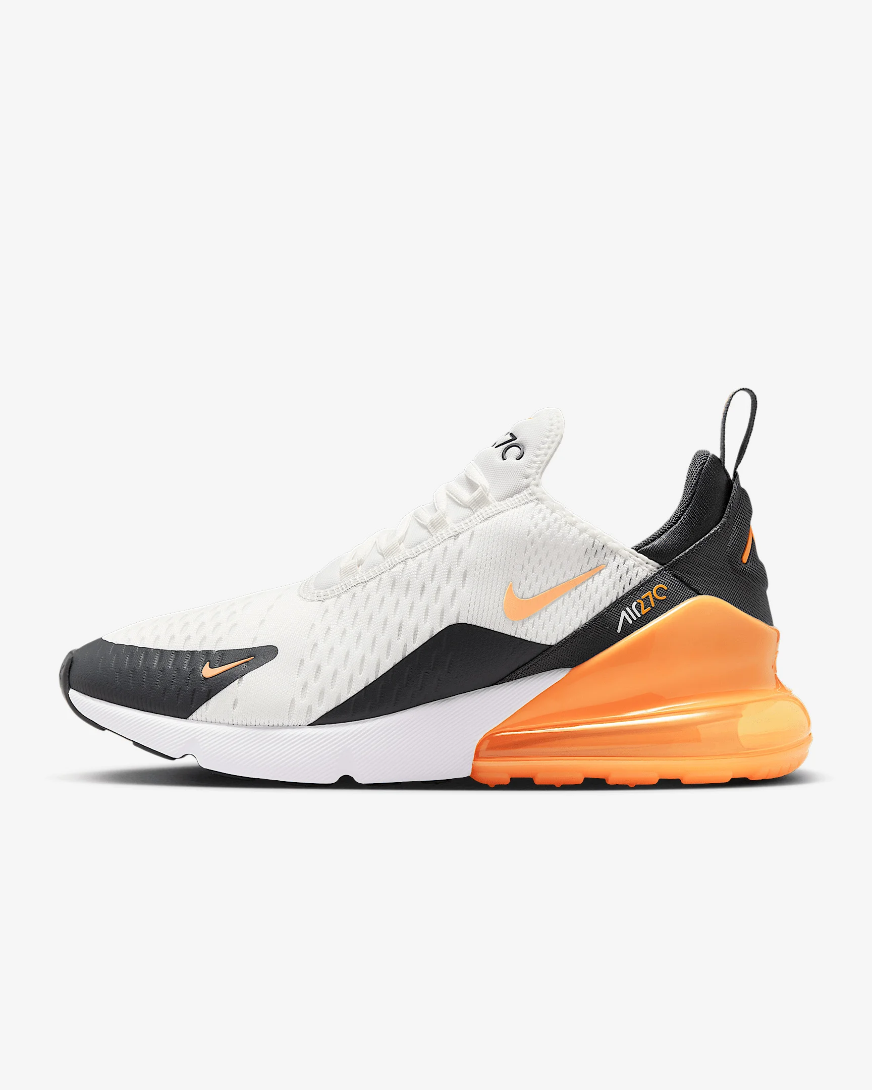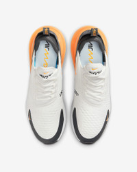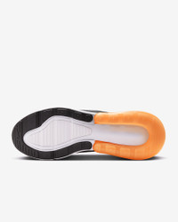 Nike's first lifestyle Air Max brings you style, comfort and big attitude in the Nike Air Max 270. The design draws inspiration from Air Max icons, showcasing Nike's greatest innovation with its large window and fresh array of colors. Benefits - The Max Air 270 unit delivers unrivaled, all-day comfort. - The sleek, running-inspired design roots you to everything Nike. - Woven and synthetic fabric on the upper provides a lightweight fit and airy feel. - Foam midsole feels soft and comfortable. - Stretchy inner sleeve and booty-like construction creates a personalized fit. - Rubber on the outsole adds traction and durability. Product Details - Mesh details for an airy feel - Synthetic and textile - 2-piece midsole - Shown: Summit White/Anthracite/White/Laser Orange - Style: AH8050-114 SIZE & FIT Fits small; we recommend ordering a half size up