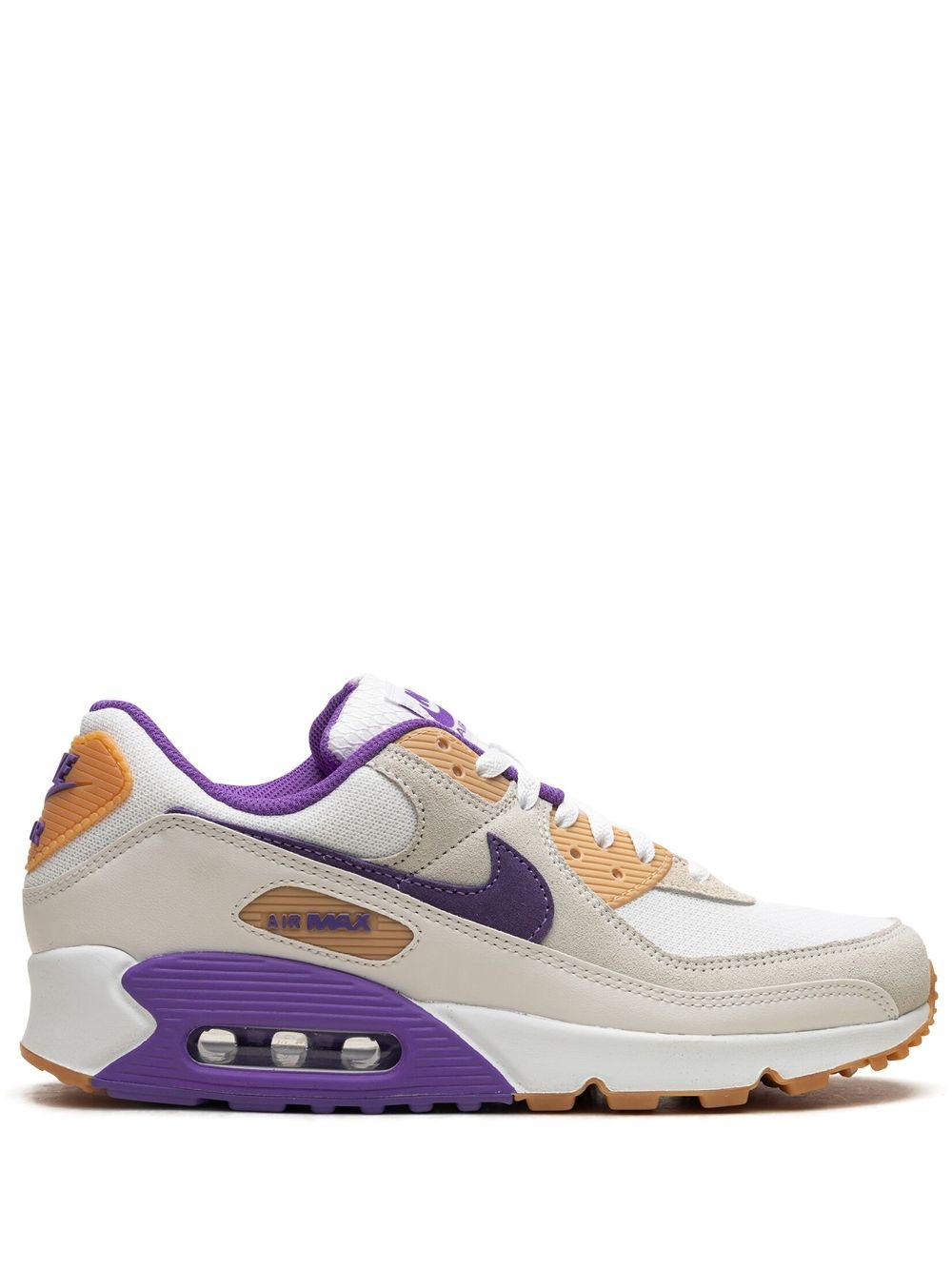 Air Max 90 "Sail Purple" sneakers This iteration of Nike's Air Max 90 sneakers is delivered in a white, yellow and purple palette. Crafted with buttery-soft leather panels, they spotlight the iconic Swoosh logo on the sidewalls — a motif inspired by the wings of the Goddess of Victory. A rubber sole with Max Air cushioning adds comfort and traction underfoot. Highlights - White/yellow/purple - Leather - Panelled design - Signature swoosh logo detail - Logo print to the side - Round toe - Front lace-up fastening - Logo patch at the tongue - Branded heel counter - Rubber sole with max air cushioning - These styles are supplied by a premium and authenticated sneaker marketplace. stocking only the most sought-after footwear, they source and curate some of the most hard to find sneakers from around the world. Imported Composition Outer: Leather 100% Sole: Rubber 100% Lining: Fabric 100%