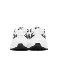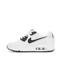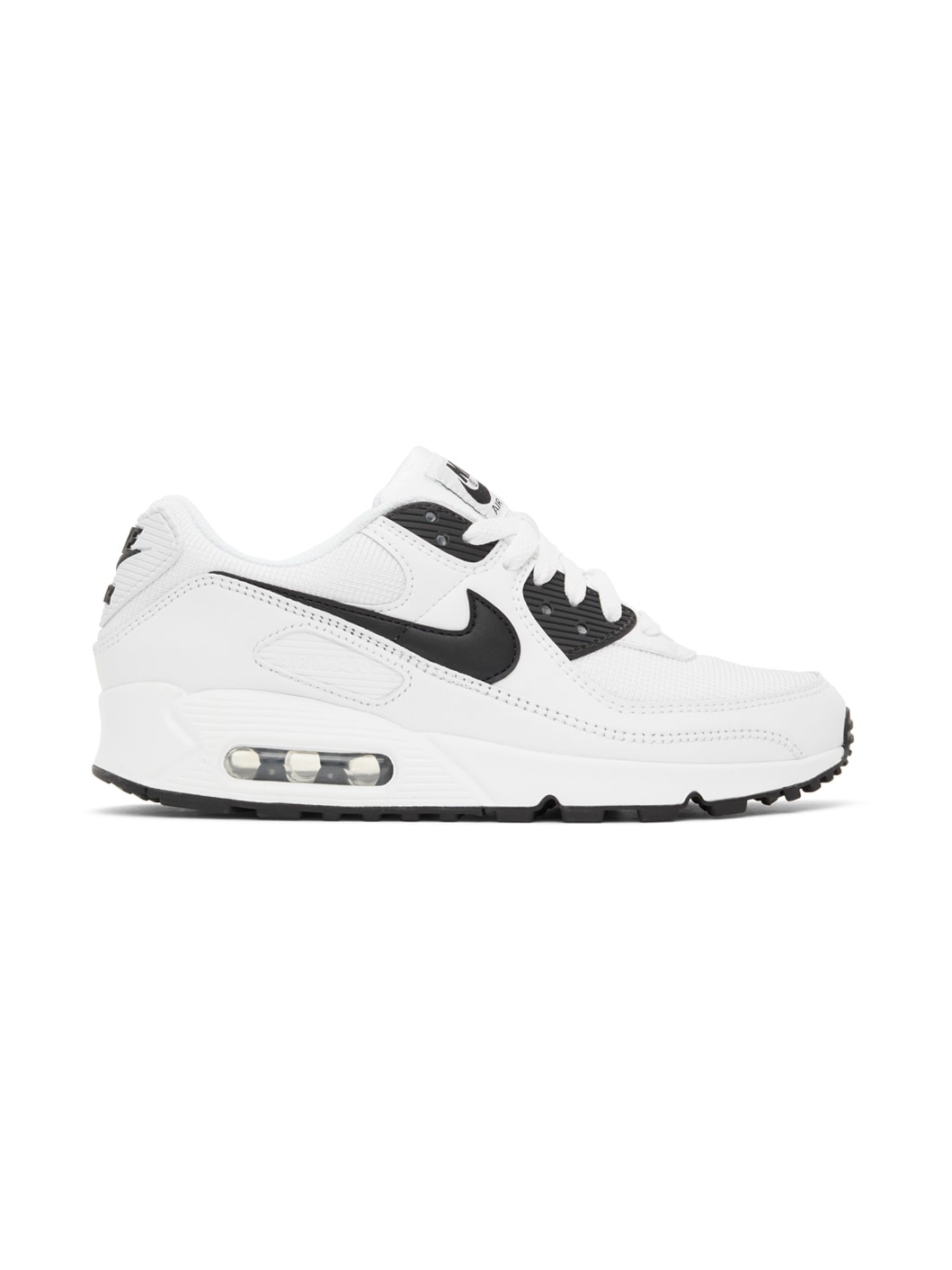 Low-top paneled leather, suede, and mesh sneakers in white. Round toe. Lace-up closure. Textile logo patch at padded tongue. Padded collar. Leather Swoosh appliqué in black at sides. Tonal rubberized logo appliqué at sides. Rubberized logo in black and white at heel tab. Mesh lining. Tonal foam rubber midsole with signature Air Sole unit. Treaded rubber outsole in black. Supplier color: White/Black Upper: leather, textile. Sole: rubber.