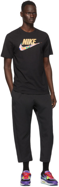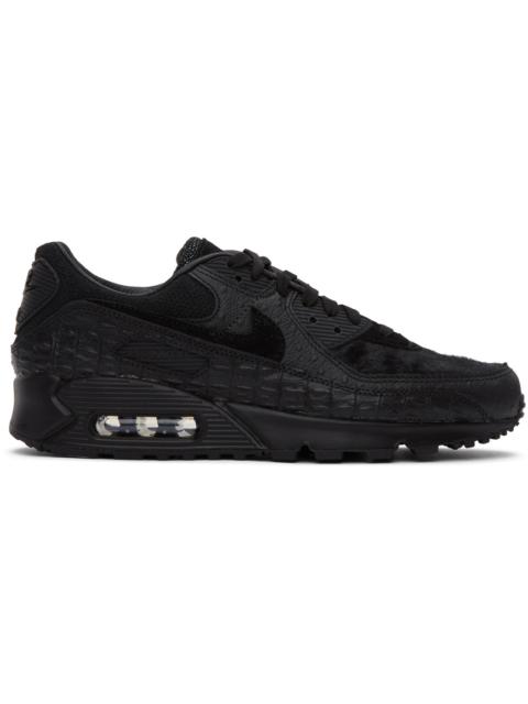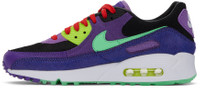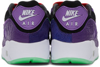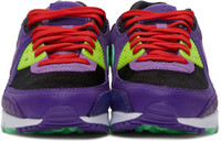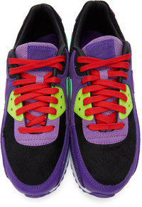 Low-top panelled leather, calf-hair, and rubber sneakers in purple. Round toe. Lace-up closure in red. Tonal logo patch at texturized padded tongue. Padded collar. Tonal and white rubberized logo appliqué at heel tab. Swoosh and rubberized logo appliqué at sides. Leather lining in black. Foam rubber midsole in white featuring signature Air Sole unit. Treaded rubber outsole in green. Supplier color: Black/Violet Pop/Violet varsity