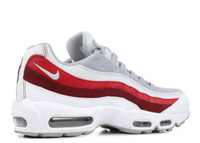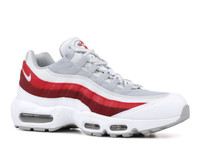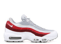 The Air Max 95 Essential 'Pure Platinum' features a largely subdued colorway, with a Wolf Grey tongue and mesh overlay complemented by white on the top and bottom leather overlays. However, the middle overlays on the shoe appear in varying shades of red, matched by the tongue branding. Underfoot, a white midsole houses visible Air in the forefoot and heel, finished with a Wolf Grey outsole. SKU: 749766 103 Colorway: White/Wolf Grey-Pure Platinum