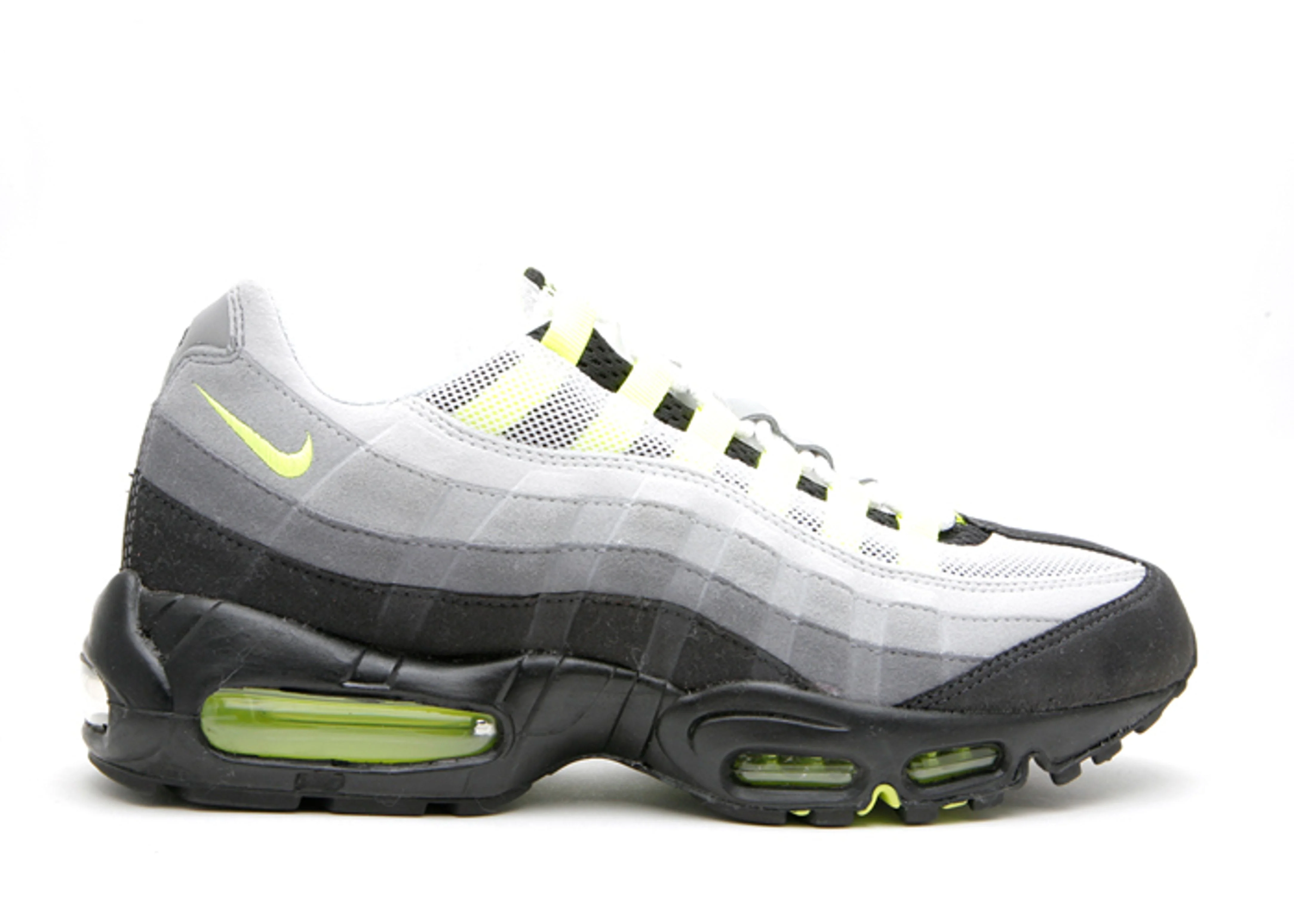 Released in February 2010, the Air Max 95 'Neon' 2010 brought back the OG 'Neon' colorway. The shoe's upper features a greyscale gradient on its signature layered construction, accented by Neon Yellow on the Swoosh branding and eyelets. Underfoot, the black midsole houses visible Air in the forefoot and heel, also finished in Neon Yellow, while a waffle pattern on the outsole provides traction. SKU: 609048 072 Colorway: Cool Grey/Neon Yellow