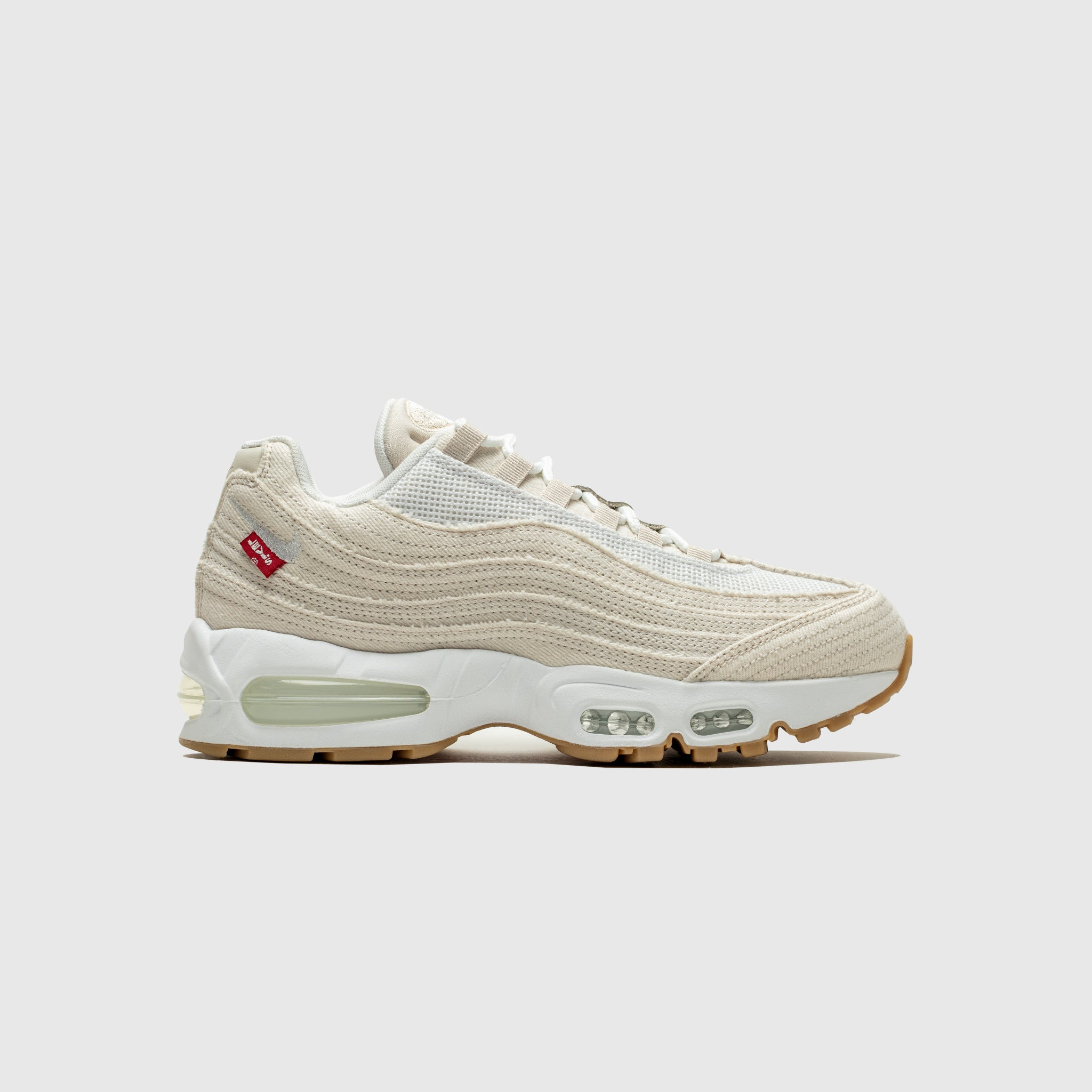 - HM4743 100 - Lt Orewood Brown/White-Gym Red - Nike and Levi's, two cultural juggernauts, join forces on two crisp colorways of denim-infused big bubble Nike Air Max 95s. - Lt Orewood Brown mesh upper - Lt Orewood Brown denim paneled upper with Lt Orewood Brown denim toe cap - Lt Orewood Brown mesh tongue withLt Orewood Brown leather lace cover & "Air Max" branding - Lt Orewood Brown canvas lace loops - Branded label at the ankle - Lt Orewood Brown leather heel panel with "NIKE AIR" branding - White foam midsole with "AIR" units in the forefoot & heel - Gum rubber outsole