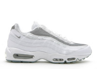 Released in 2009 as part of Nike's Nintendo Wii Pack, the Air Max 95 Premium 'Wii' sports a white and silver colorway, mimicking the gaming console. A power button icon on the tongue and a see-through side panel nod to the Wii's design. The rest of the design is true to AM95 details, using a patent leather upper, silver mesh, and exposed Nike Air heel and forefoot units. SKU: 313071 101 Colorway: white/metallic-silver