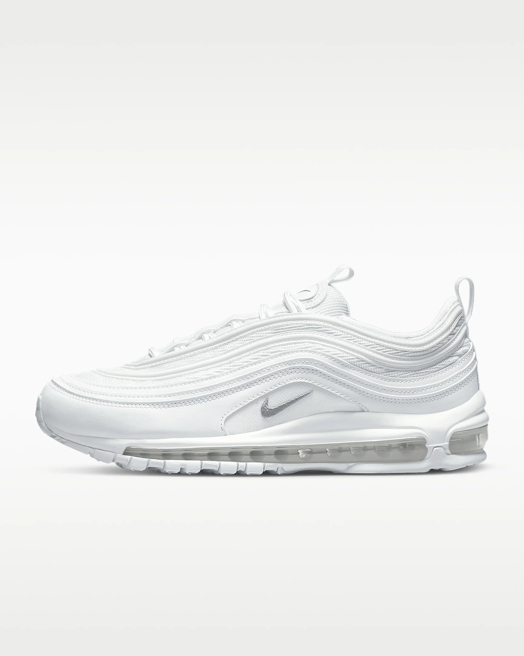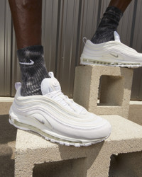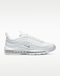 Featuring the original ripple design inspired by Japanese bullet trains, the Nike Air Max 97 lets you push your style full-speed ahead. Taking the revolutionary full-length Nike Air unit that shook up the running world and adding fresh colors and crisp details, it lets you ride in first-class comfort. Benefits - Mesh and synthetic materials on the upper keep the fluid look of the OG while adding comfort and durability. - Originally designed for performance running, the full-length Max Air unit adds soft, comfortable cushioning underfoot. - The foam midsole feels springy and cushy. - The rubber outsole adds traction and durability. Product Details - The foam sockliner feels soft and comfortable - Pull tab - Not intended for use as Personal Protective Equipment - Shown: White/Black/Wolf Grey - Style: 921826-101 SIZE & FIT Fits small; we recommend ordering a half size up