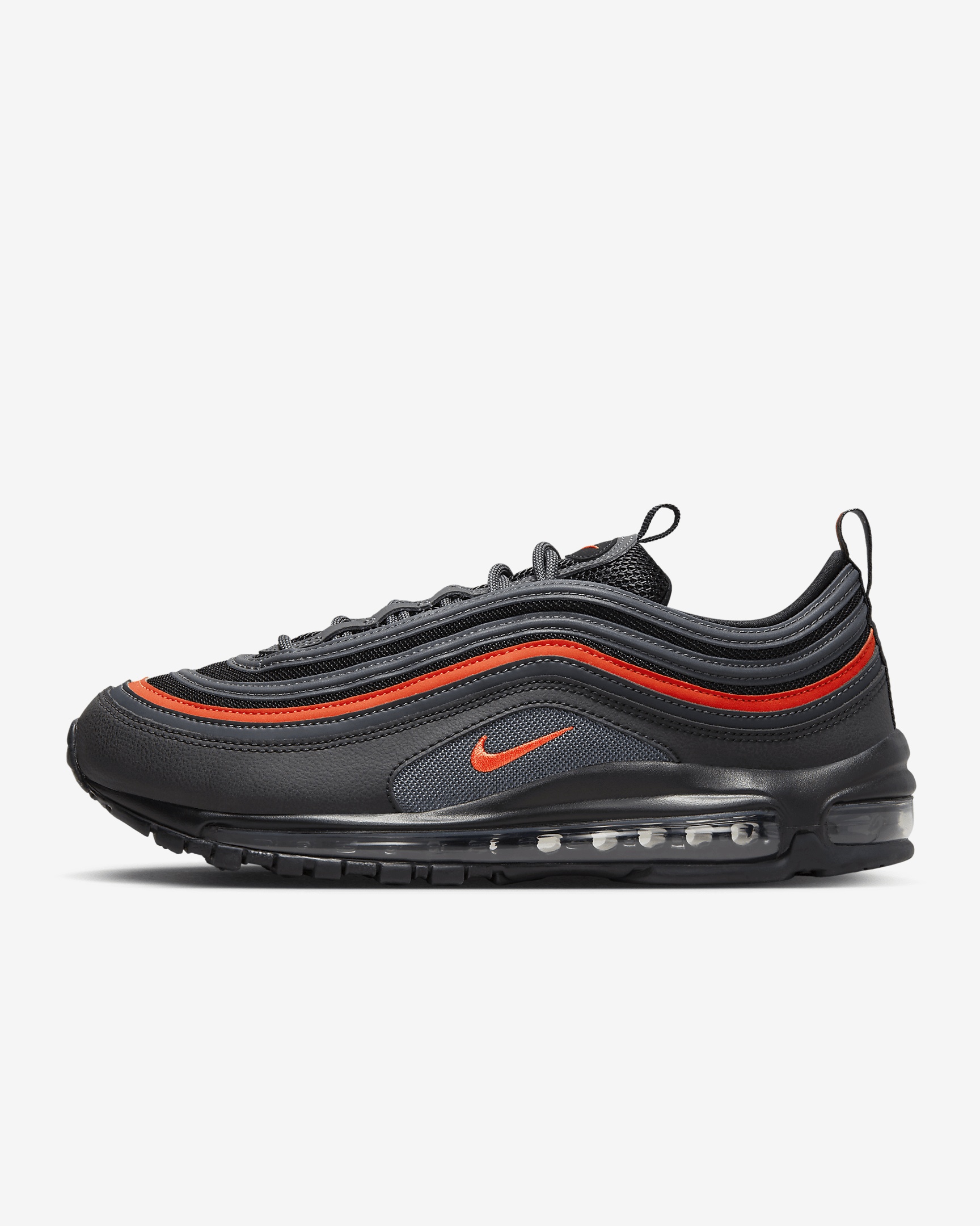 Featuring the original ripple design inspired by Japanese bullet trains, the Nike Air Max 97 lets you push your style full-speed ahead. Taking the revolutionary full-length Nike Air unit that shook up the running world and adding fresh colors and crisp details, it lets you ride in first-class comfort. Benefits - Mesh and synthetic materials on the upper keep the fluid look of the OG while adding comfort and durability. - Originally designed for performance running, the full-length Max Air unit adds soft, comfortable cushioning underfoot. - The foam midsole feels springy and cushy. - The rubber outsole adds traction and durability. Product Details - The foam sockliner feels soft and comfortable - Pull tab - Not intended for use as Personal Protective Equipment - Shown: Black/Anthracite/Picante Red - Style: 921826-018 SIZE & FIT Fits small; we recommend ordering a half size up