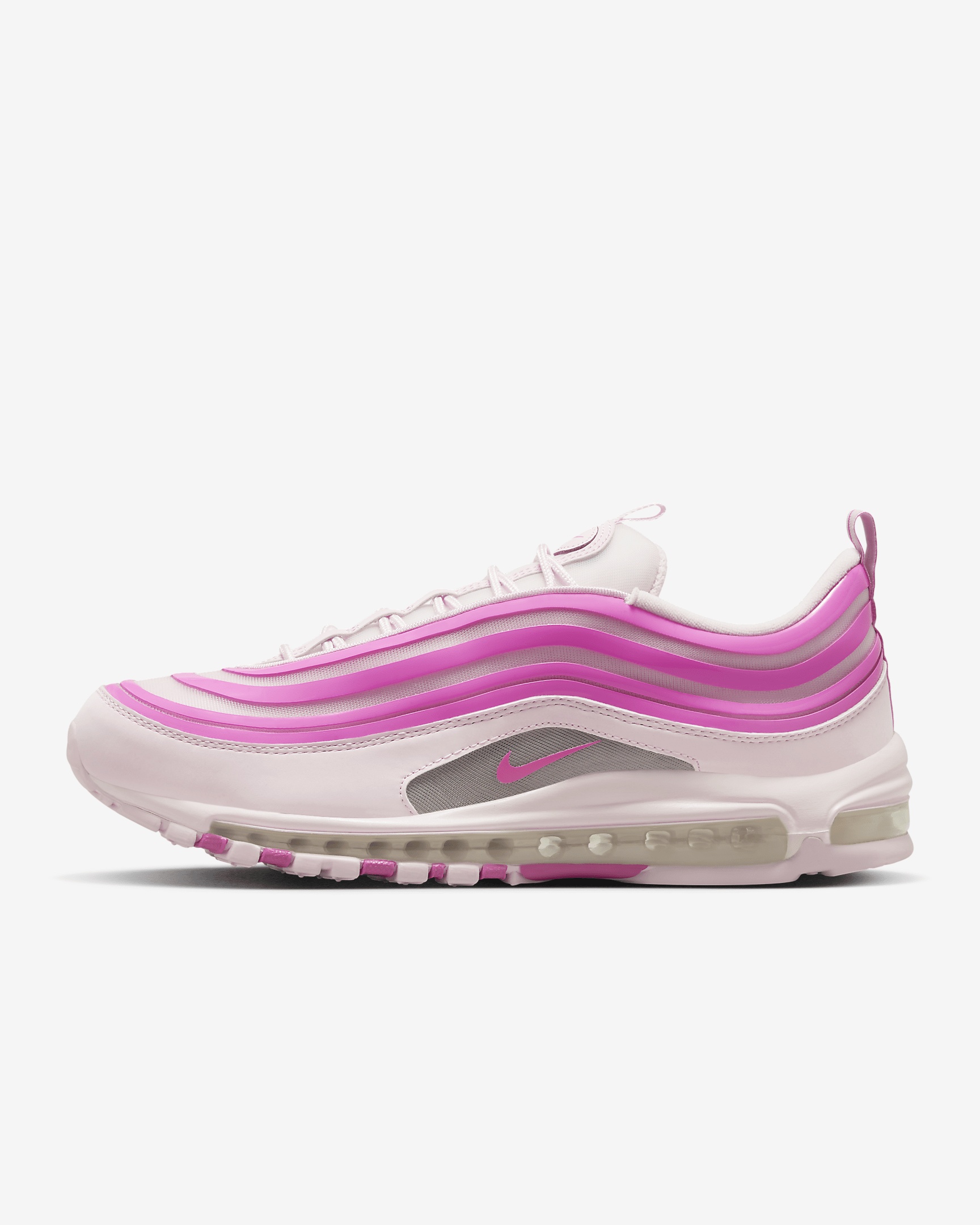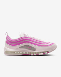 Sleek. Stylish. Simple. The Air Max 97's water-inspired design flows whether you're out for a run or a night on the town. Visible Air cushioning lets you ride in performance comfort, while UV blacklight ink on the upper makes these a staple for day and night. Benefits - Originally designed for performance running, full-length Nike Air cushioning (the first of its kind) pairs best-in-class comfort with sporty style. - Hidden lacing system delivers a streamlined look. - Foam midsole delivers plush cushioning. - Rubber outsole adds traction and durability. Product Details - Shown: Pink Foam/Pink Foam/Playful Pink - Style: FJ2588-600