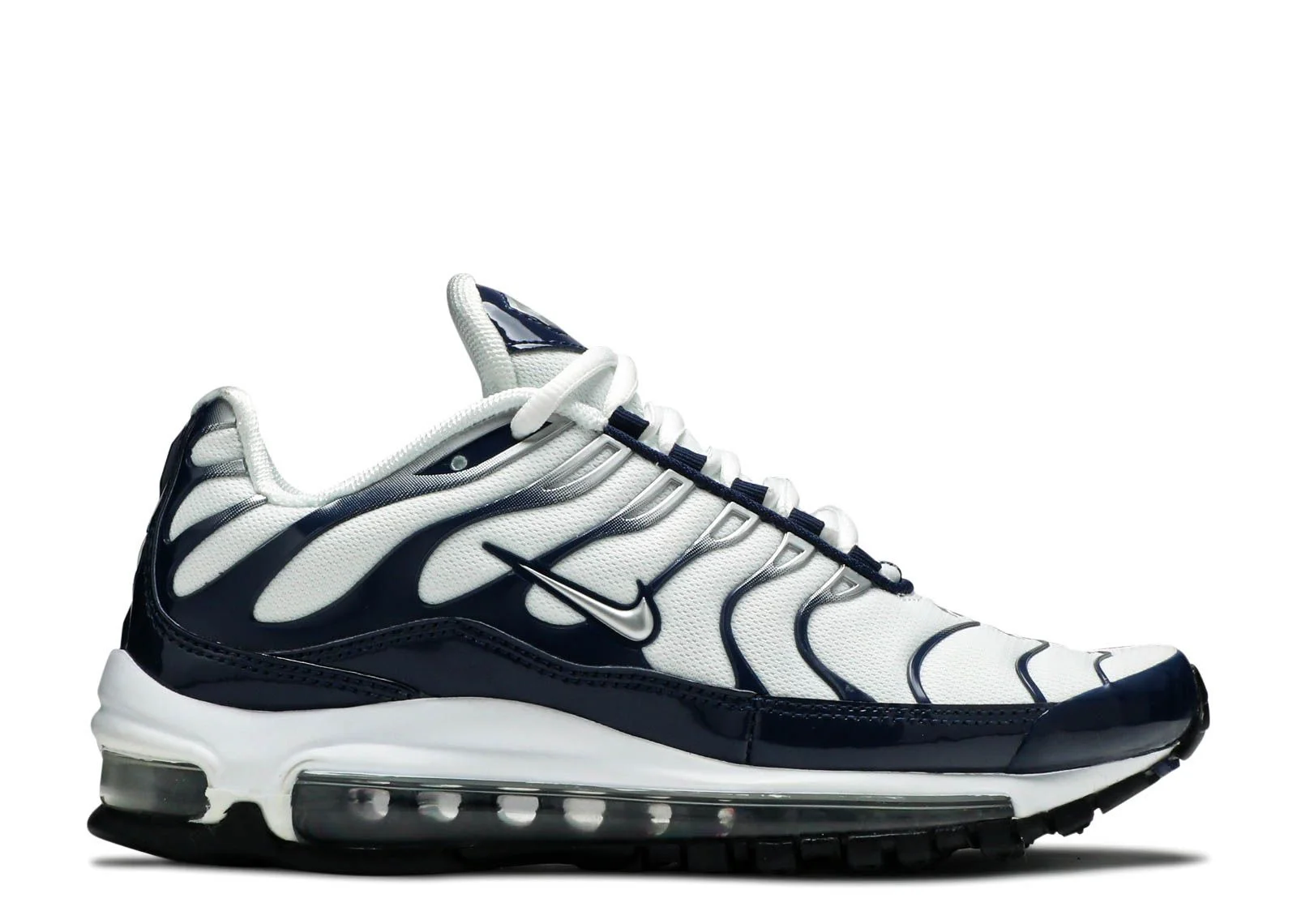 True to its name, the Air Max 97 Plus 'Silver Shark' sports an upper famously nicknamed “Le Requin” because of its resemblance to the ocean’s infamous predator. The silhouette’s white mesh is reinforced by blue-to-silver overlays and a blue patent leather mudguard. Completing the look are a clear Air sole, black rubber outsole, and metallic silver details. SKU: AH8144 100 Colorway: White/Midnight Navy-Metallic Silver Release Date: 6/16/18