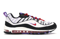 The Nike Air Max 98 Raptors were designed by Sergio Lozano. They pay homage to the original Air Max 98 Gundam with a modern twist and a colorway borrowed from the Raptors. A white, black, and psychic purple colorway is chosen for this Max 98 Raptors sneaker. The upper is made using layered leather and mesh in black and white. The tongue is purple. The lateral quarter panel features the swoosh in red with a purple outline, while the medial quarter panel has an ellipse purple overlay. A white overlay on the vamp has the swoosh in purple. The upper mesh layer in white has black stripes along the quarter panels and vamp, while purple pinstripes are at the rear. The shoe has red laces, a white midsole with translucent Air Max units, and a black and purple rubber outsole. What do our experts think of the Nike Air Max 98 Raptors? StockX experts like the color clashing of the colorway, and the use of Air Max units on an OG design. The 98 Raptors Air Max was released on 8th August 2019 for $160. - Style 640744-110 - Colorway WHITE/BLACK-PSYCHIC PURPLE - Retail Price 160 - Release Date 2019-08-08 - Featured false - Product Line Nike Air Max