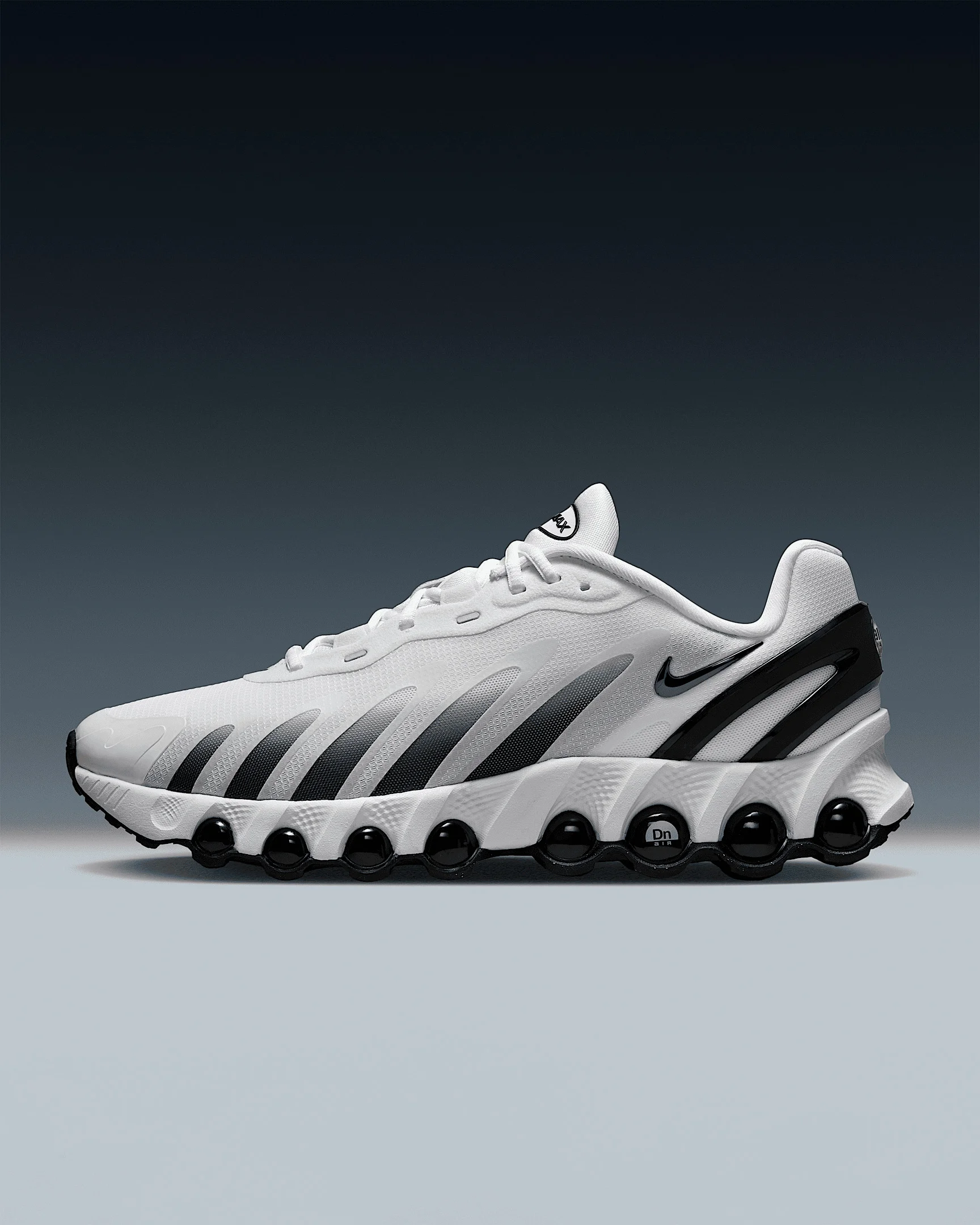 More Air, less bulk. The Dn8 takes our Dynamic Air system and condenses it into a sleek, low-profile package. Powered by eight pressurized Air tubes, it gives you a responsive sensation with every step. Enter an unreal experience of movement. More Benefits - Plastic heel clip helps hold your foot down for more containment. - Extra layer across toe tip adds durability. Product Details - Foam midsole - Rubber outsole - Shown: White/White/White/Black - Style: FQ7860-100