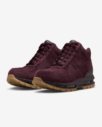 With a history rooted in rugged exploration, the Nike Air Max Goadome celebrates 2 decades of tough city style and outdoor adventure. The leather on the upper helps shield you from the elements and features the classic overlay construction you trust. Visible Air units underfoot combine with a soft foam midsole to cushion your journey while rugged tread on the outsole gives your style traction. Benefits - The durable upper is made with tough leather. - The padded, high-top collar adds comfort around your ankle and locking in the warmth and adding stability. - The visible Air units in the heel and forefoot cushion every step. - The rubber outsole features an aggressive lug pattern for added traction, durability and a rugged look. - The perfect blend of form and function after 20 years, the timeless design is rugged enough for the mountains, yet practical enough for the streets. Product Details - Rubber outsole - ACG branding on the midsole - Metal eyelets - Perforations on side - Embossed Swoosh design - Shown: Deep Burgundy/Gum Medium Brown/Deep Burgundy - Style: 865031-602