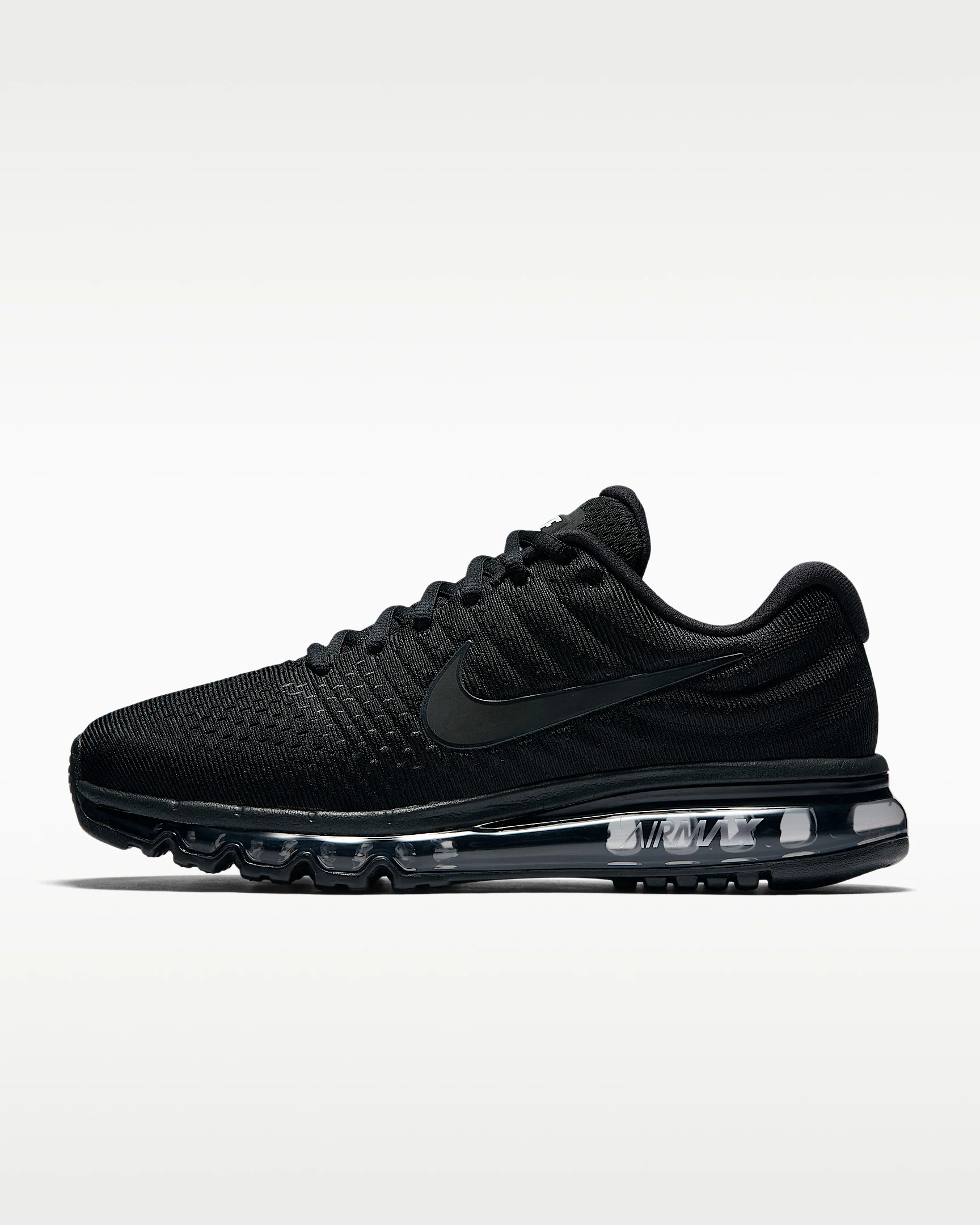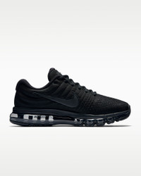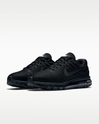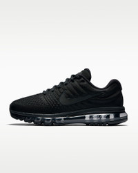 The Nike Air Max 2017 delivers the plush sensation you love with a full-length Max Air unit. The upper is seamlessly constructed with zonal support and ventilation while molded foam wraps your mid-foot and heel for secure comfort. Benefits - Flymesh and synthetic upper provides breathable support. - Full-length Max Air unit delivers enhanced cushioning. - Foam molded into the midfoot wraps the arch for a snug fit. - Sculpted Cushlon midsole combines plush cushioning with springy resilience for impact absorption. Product Details - Not intended for use as Personal Protective Equipment (PPE) - Shown: Black/Black/Black - Style: 849559-004