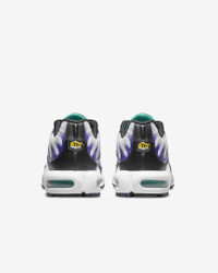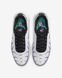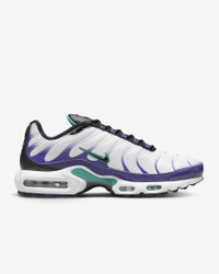 Let your attitude have the edge with flame-like caging that adds heat to the streets while airy mesh keeps you cool. The Nike Air Max Plus gives you a tuned Nike Air experience that offers premium stability and unbelievable cushioning. Benefits - Bringing no-worry beach life to the city, the supportive midfoot arch draws inspiration from a whale's tail. - Design lines of the iconic plastic cage nod to palm trees and ocean waves. - Originally designed for performance running, Nike Air units provide lightweight cushioning that lasts. - Synthetic upper with lightweight mesh adds breathability and durability. - Rubber outsole gives you durable traction. Product Details - Shown: White/Grape Ice/New Emerald/Black - Style: DM0032-100