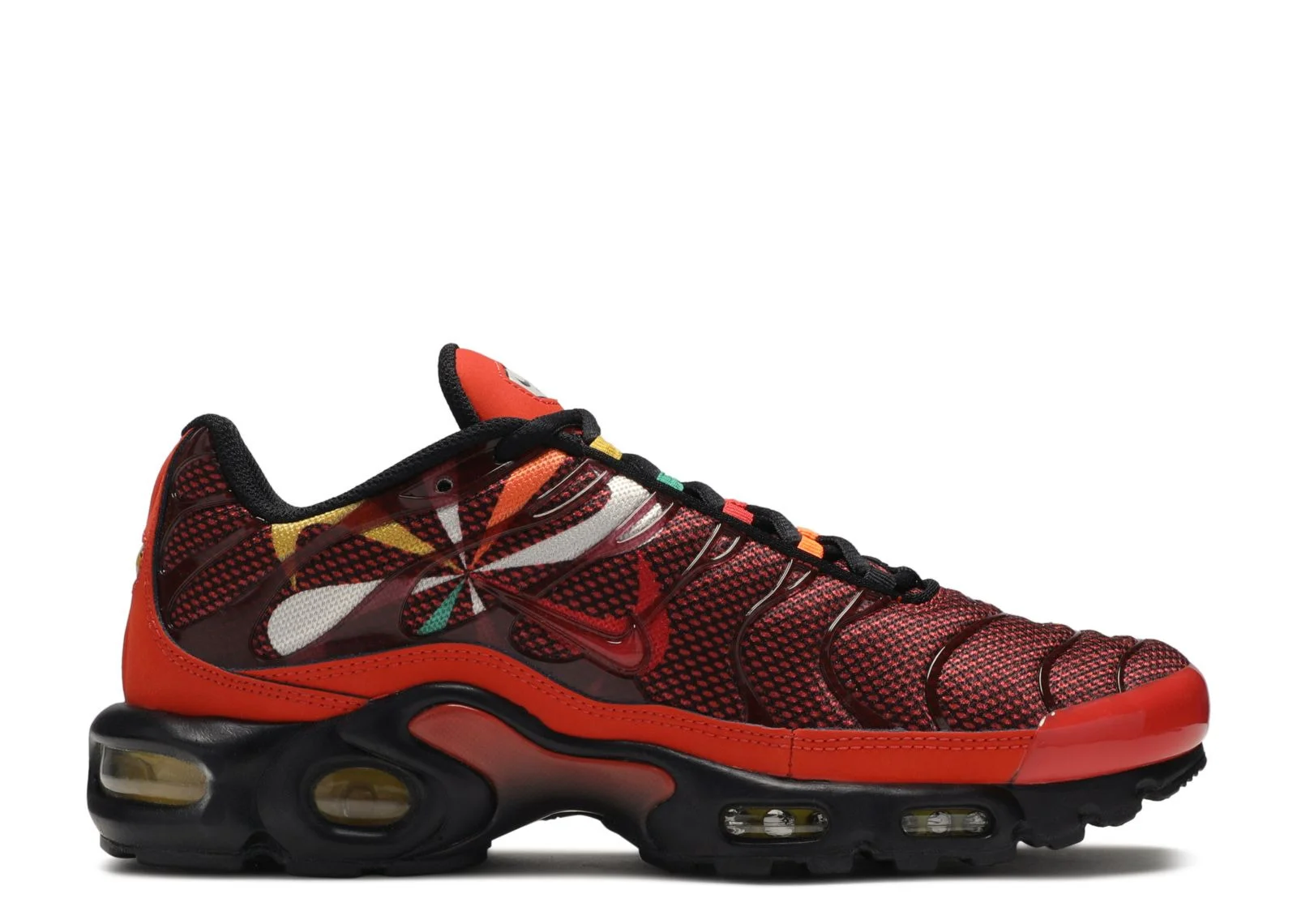 The Air Max Plus 'Sunburst' released in August 2019 as part of three discrete packs collected under the ‘Evolution of the Swoosh’ banner. The retro runner showcases Nike’s vintage Sunburst logo, printed in oversized fashion on the lateral side of the red and black mesh upper. The lightweight build sits atop a black foam midsole, fitted with visible Max Air units tinted yellow. SKU: CK9393 600 Colorway: Habanero Red/University Gold/Black Release Date: 8/28/19