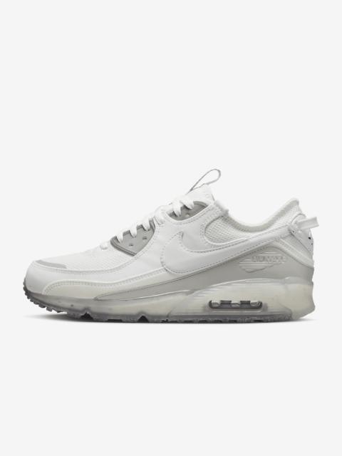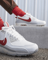 Air Max goes crunchy granola. The updated design pairs durable fabrics with colors that throw it back to your mom's favorite ski jacket from the '90s. You can throw them on or easily hook them to your pack with webbing pull tabs that double as clip points. A little crunch goes a long way, though—the classic Air technology makes every trail feel like you're literally walking on Air. Benefits - Tough material on the upper is lightweight yet durable. - Triple-stitching around the collar helps eliminate hot spots. - Crater foam midsole adds stability to every step. - Originally designed for performance running, the Max Air unit in the heel adds lightweight cushioning. - Translucent rubber wraps onto the mudguard for added durability. Product Details - New Terrascape logo - Padded collar - Rubber outsole - Shown: Summit White/Pure Platinum/Wolf Grey/Red Clay - Style: DQ3987-100
