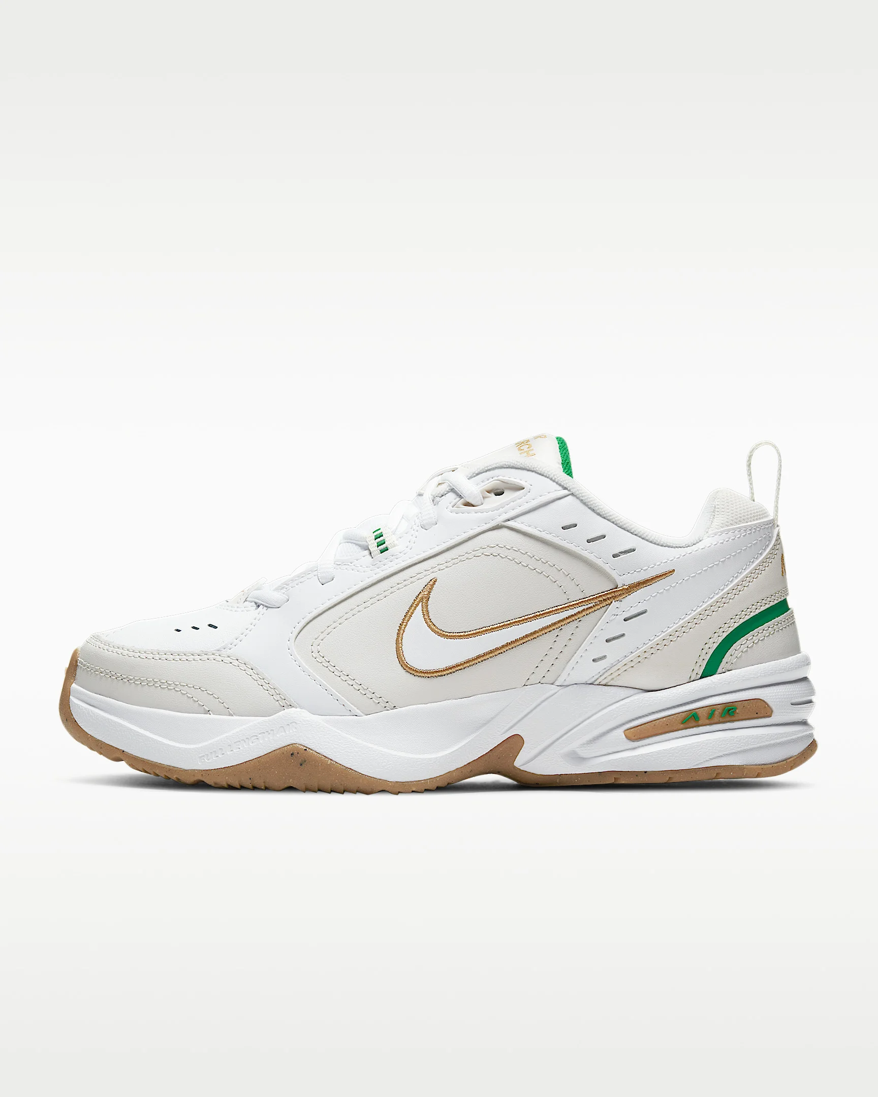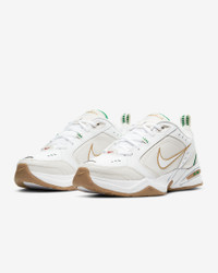 Nike Air Monarch IV sets you up for working out with durable leather on top for support. Lightweight foam teams up with Nike Air cushioning for comfort in every stride. Benefits - Leather and synthetic leather are durable with a classic look. - Full-length encapsulated Air-Sole unit cushions for comfort and support. - Solid rubber sole is durable and provides traction over varied surfaces. Product Details - Shown: White/Phantom/Lucky Green/Metallic Gold - Style: 415445-103 SIZE & FIT Fits small; we recommend ordering a half size up