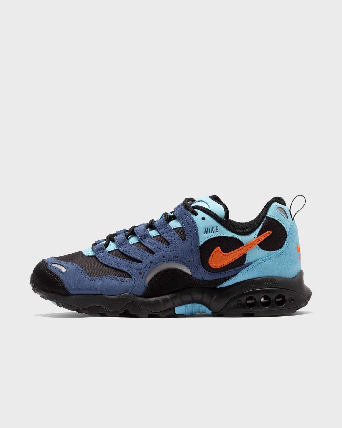 The Nike Air Terra Humara was developed in 1997 with the aim of supporting courageous hikers on their search for new paths and adventures. This current version comes in a stylish layered look: suede in Mystic Navy, woven textiles in Aquarius Blue and accents in Safety Orange make the shoe a real eye-catcher. The outsole has a grippy profile for optimum traction. The soft foam midsole contains a Max Air element in the heel area for comfortable cushioning and good grip. Article Number: FQ9084-400 Gender: Men Color: MYSTIC NAVY/SAFETY ORANGE-BLACK Material: Upper material: 100% Synthetic/Textile