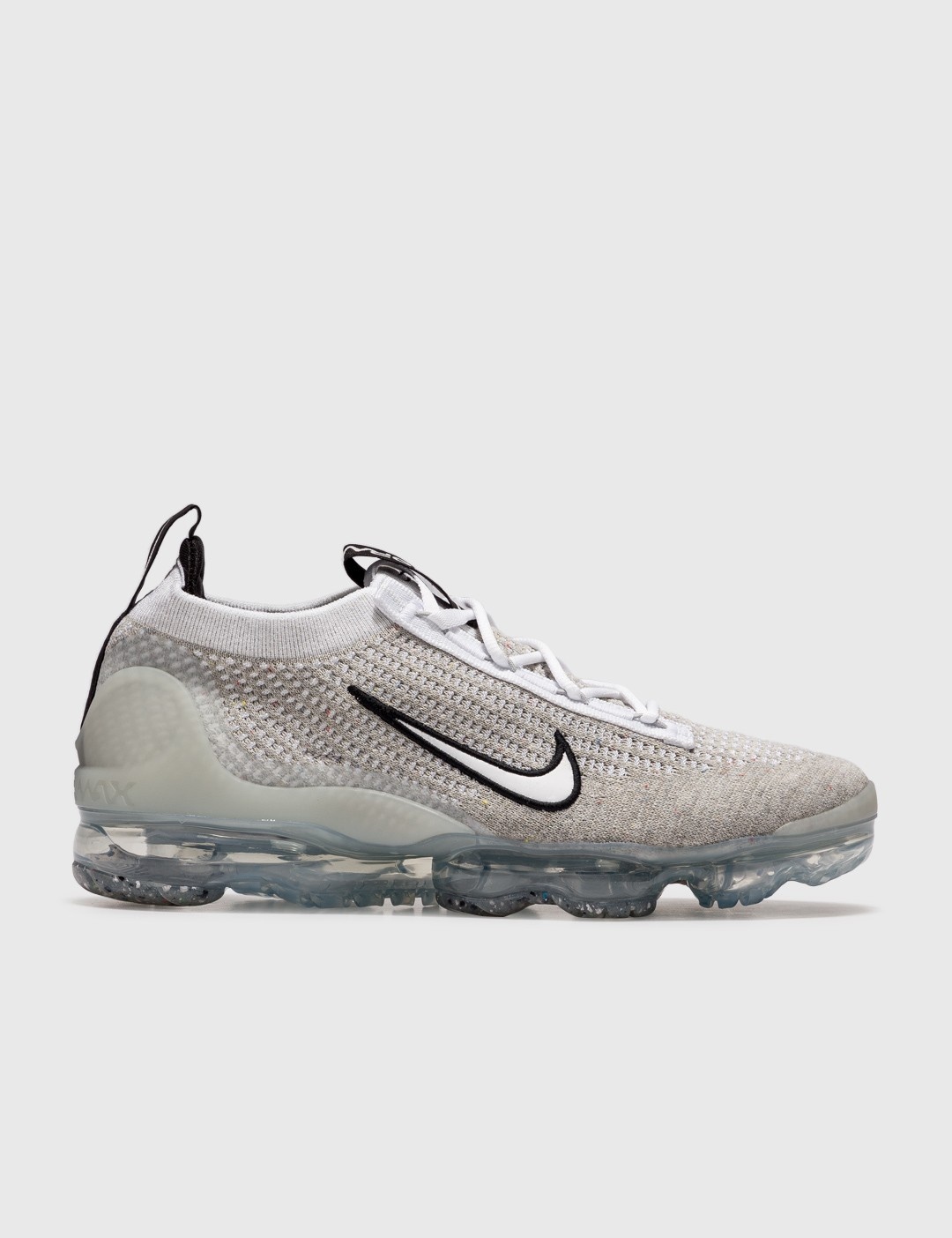 - Nike - Nike AIr Vapormax 2021 FK - Flyknit upper - Sock-like collar - Lace-up closure - Embroidered white Swoosh in black outline - Transparent VaporMax cushioning - Rubber outline - Color: White/Black/Metallic Silver - Material: Flyknit, Rubber - See more Sneakers and Shoes