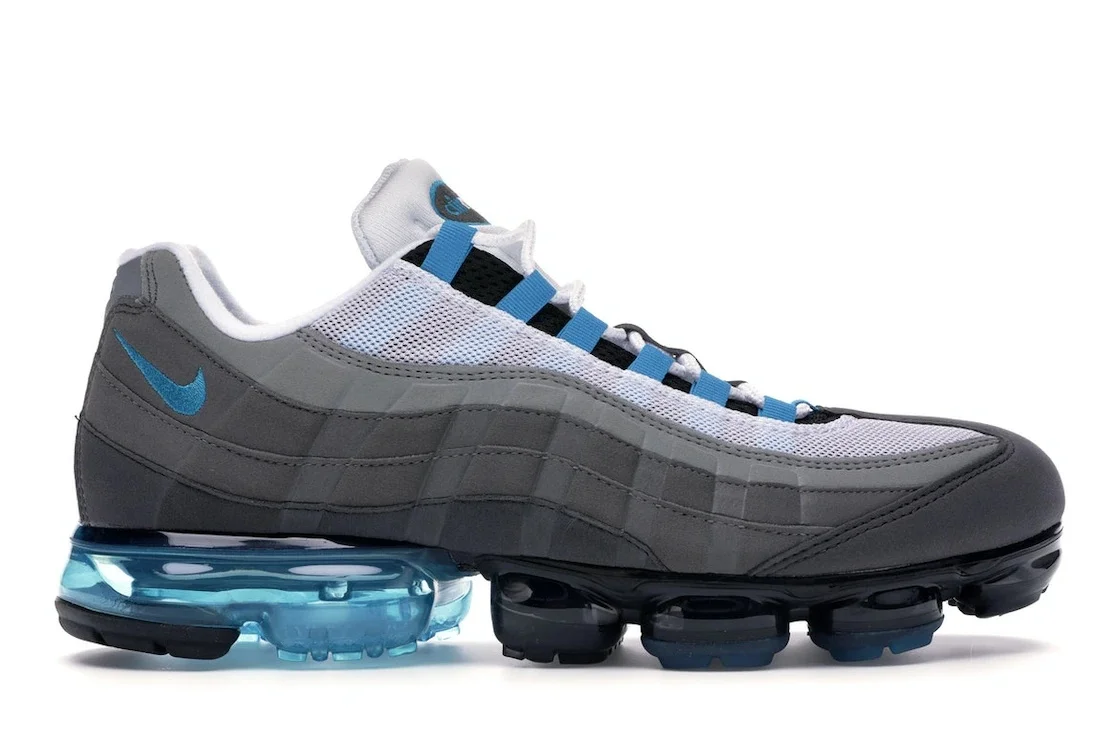 The Nike Air VaporMax 95 Neo Turquoise returns in a NeoTurquoise colourway. Made of nubuck and mesh upper, the runner Air Max 95 features Black, Neo Turquoise, Medium Gray, and Dark Pewter themes with gray tones mixed with white and turquoise tones The new technology and exclusive 'Neo Turquoise' detail in popular colors. A gray gradient enhances the widespread majority of its top, and blue factors can be seen on its lateral Swoosh branding and lacelets, while white mesh takes form on its forefoot with leather, making its presence recognized within the equal coloration on its throat. This shoe sports a full-duration Air VaporMax sole, painted in a tonal turquoise to tie in with the top. The Nike Air VaporMax 95 Neo Turquoise brought two legends together. What our experts love about this shoe is the laces, mini Swoosh, and Air unit that feature the text Neo Turquoise. The Nike Air VaporMax 95 Neo Turquoise was released on January 18th, 2018, retailing for $190. - Style AJ7292-002 - Colorway Black/Neo Turquoise-Medium Ash-Dark Pewter - Retail Price 190 - Release Date 2018-11-01 - Featured false - Product Line Nike Air Max