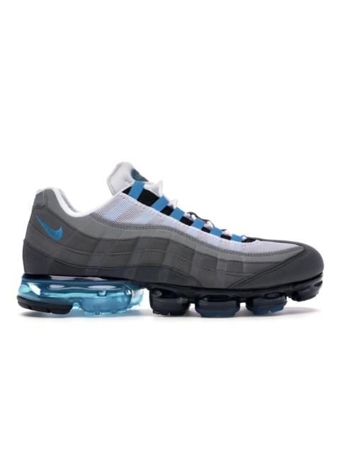 The Nike Air VaporMax 95 Slate features blue hues with white accents. The instantly recognizable grade-it detailing along the racing stripes pays tribute to an earlier Nike classic. The VaporMax 95 Slate draws inspiration from the AirMax 95 OG. The leather and mesh upper flaunt shades of color that start at the top with obsidian blue, quickly transitioning to French blue, lake blue, and finally white on the midsole. Underneath is a full-length VaporMax sole unit with blue shades across its translucent core. The eyelets utilize blue tones to tie in with the blue motifs. The gradient detailing is offset by a mesh vamp dressed in white to the toe box. Reflective accents on the heel and a new green swoosh near the mudguard wrap up the sneakers' design. What our experts love about the 95 Slate sneakers is their full-length VaporMax sole unit, which delivers lightweight cushioning. The sole also has rubber pods for increased traction on various surfaces. The Nike Air VaporMax 95 Slate was released on September 6, 2018, retailing for $190. - Style AJ7292-100 - Colorway White/New Green-French Blue-Lake Blue - Retail Price 190 - Release Date 2018-09-06 - Featured false - Product Line Nike Air Max