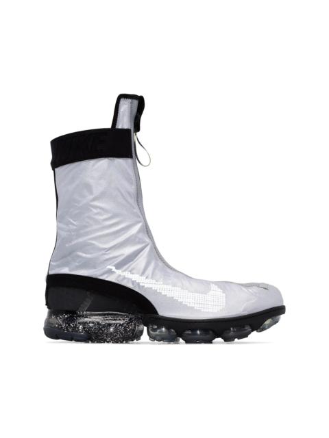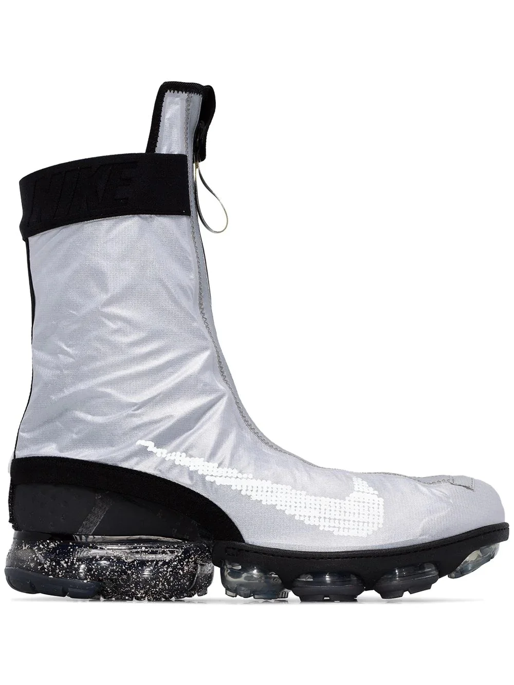 Air Vapormax Flyknit Gator ISPA sneakers Don't let the rain stop you from your morning jog. Go outside and let your feet pound the pavement in these Nike grey Air Vapormax ISPA Gator sneakers that have a layered design with a front zip fastening up to the ankles that keep your soles dry as you make your way through the miles. Stay fit, no matter what the weather looks like outside. Featuring a round toe, a layered design, a front zip fastening, a lace-up front fastening, a logo tag, an ankle length and a ridged rubber sole. Imported Composition Outer: Polyamide 100% Lining: Polyamide 100% Sole: Rubber 100% SIZE & FIT Model measurements Height 6 ft 2 in(1.87 m) Bust/Chest 36.61 in(93 cm) Hips 35.03 in(89 cm) Waist 27.95 in(71 cm) FittingInformation This piece fits true to size. We recommend you get your regular size Measurement HEEL 1.37 in(3.5 cm) Sole height 0.59 in(1.5 cm) HEIGHT 7.87 in(20 cm)