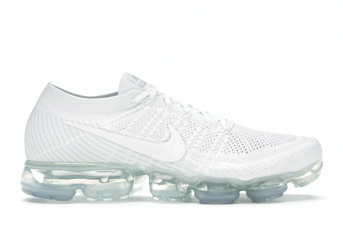 The Nike Air VaporMax Triple White combines fabrics and textures in this monochromatic shoe and sets it all atop a singularly impressive sole unit. The Triple White version of the Air VaporMax features a FlyKnit upper in patterns of more loosely and more tightly woven mesh. The heel of this shoe is overlaid with synthetic striping for support, and Flywire adds structure on the side panel beneath the tonal Nike Swoosh. White laces crossover a perforated white tongue that sports a tonal tongue patch with faded silver Nike branding. VaporMax branding accents the white heel tabs and the white insoles. The outsole is constructed of thick translucent rubber providing traction in capsule and horseshoe shapes, and a Nike Swoosh brands the center heel of the outsole. The future we love most about this shoe is its stand-out midsole, which houses a full-length translucent VaporMax Air unit. The Nike Air VaporMax Triple White was released on December 23rd, 2017, for a retail price of $190. - Style 849558-100 - Colorway White/White-Sail-Light Bone - Retail Price 190 - Release Date 2017-12-23 - Featured false - Product Line Nike Air Max