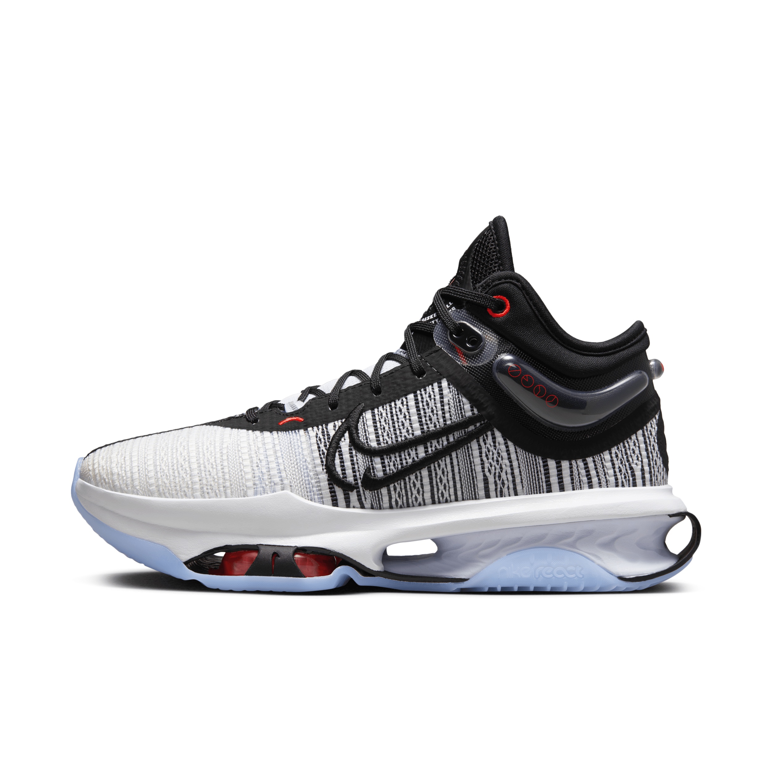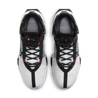 How high do you want to fly? Get off the ground quicker in a design that helps you hover and hold your own in the air when the action goes vertical. If you’re a shooter trying to add lift to your jumper, a skyscraper hoping to float among the stars, or a ground bound beast trying to beat your opponent to that rebound off the rim, this shoe can add an element of explosiveness to your game. The bounce is unlike anything you’ve felt before, and the landing is cushioned, helping you spring back skyward once you hit the ground. Ready for Takeoff:Three doses of Zoom Air (bottom layer of the upper and 2 forefoot units) give you more bounce off the floor. It combines with the jump plate, wrapped with rubber for added support and durability, for an extra spring. Land Softly:Nike React foam in the heel offers cushioning and comfort when landing suddenly and powerfully. The molded heel has an engineered curve for energy absorption and support. Iconic heel and collar design provide lightweight containment and manage micro-movements of the foot. Lightweight Design:The exoskeleton look and feel uses negative space to make the shoe lightweight. Pick Your Direction:The herringbone traction uses data-informed design to create grip on the court. Linear and lateral lines provide multidirectional grip that helps reduce slipping and sliding. More Benefits:Lacing directly through the medial and lateral webbing loops adds forefoot support. Engineered mesh provides lightweight, breathable comfort and containment. Style: DJ9431; Color: Black/White/Blue Tint/Black; Size: 8; Gender: Male; Age Group: Adult | Nike G.T. Jump 2 Men's Basketball Shoes in Black, Size: 8 | DJ9431-001