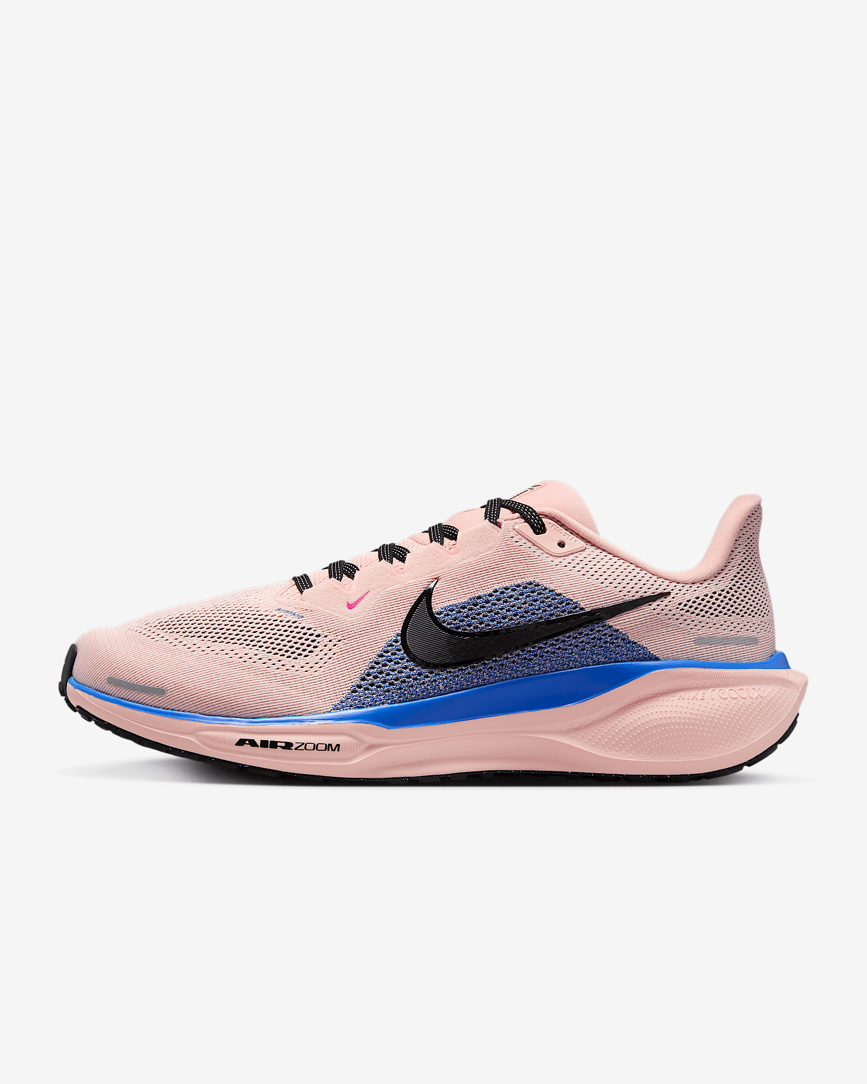 Responsive cushioning in the Pegasus provides an energized ride for everyday road running. Experience lighter-weight energy return with dual Air Zoom units and a ReactX foam midsole. Plus, improved engineered mesh on the upper decreases weight and increases breathability. Benefits - Upgraded breathable engineered mesh upper - ReactX foam midsole surrounds forefoot and heel Air Zoom units for an energized ride. - Signature waffle-inspired rubber outsole for traction and flexibility - Plush collar tongue and sockliner for a secure and comfortable fit - What's new? All-new ReactX foam midsole is 13% more responsive than previous React technology. - Crafted for performance and planet, ReactX foam is engineered to reduce its carbon footprint by at least 43% in a pair of midsoles due to reduced manufacturing process energy compared to prior React foam. The carbon footprint of ReactX is based on cradle-to-gate assessment reviewed by PRe Sustainability B.V and Intertek China. Other midsole components such as airbags, plates or other foam formulations were not considered. Product Details - Weight: Approx. 297 g/10.4 oz (Men's US 10) - Heel-to-toe drop: 10 mm - MR-10 Last - Our best, most consistent fit (same as Pegasus 40) - Not intended for use as Personal Protective Equipment (PPE) - Shown: Washed Coral/Racer Blue/Hyper Pink/Black - Style: FD2722-603