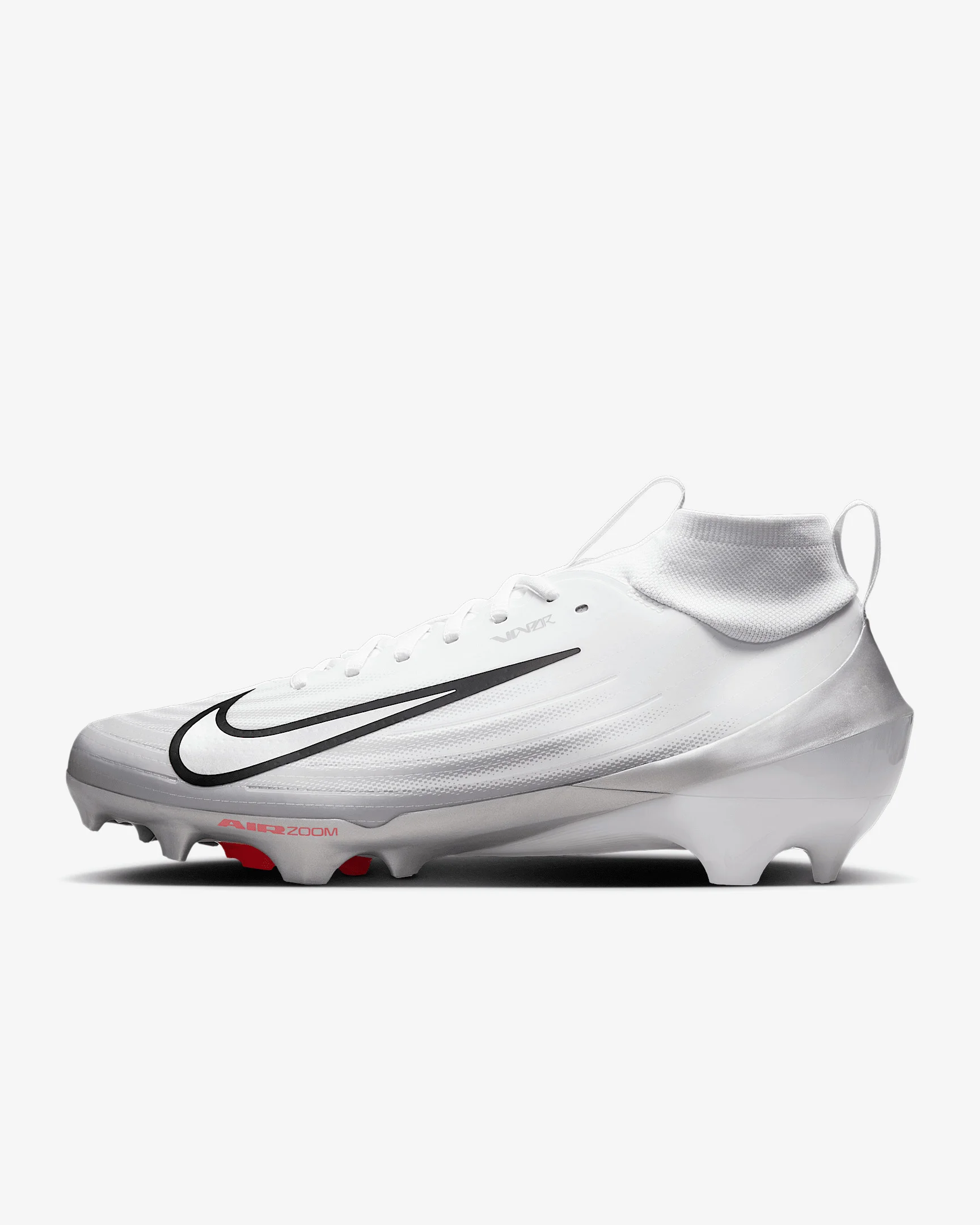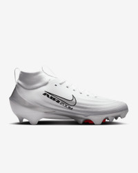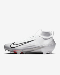 With Air Zoom cushioning so responsive you’ll burst off the line of scrimmage, the Nike Vapor Pro 1 is designed to help you take your speed to the next level. Benefits - Mesh combines with inner sleeve to provide a breathable, snug fit. - Forefoot Air Zoom unit stitched to the upper offers unreal responsiveness when making sudden, swift moves. - Vapor plate is lightweight, yet structurally strong. - Wide stud placement ensures optimal multidirectional traction. - Molded plastic around the heel offers stability for your ankle and Achilles. Product Details - Shown: White/Black/Summit White/Metallic Silver - Style: FB3298-100