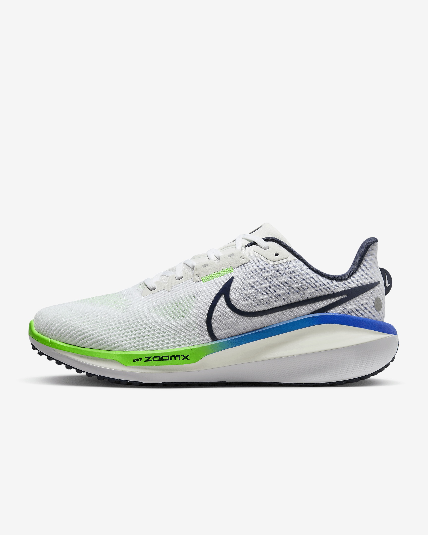 Maximum cushioning provides a comfortable ride for everyday runs. Experience enhanced comfort in this latest version with a dual-density midsole made with a combination of ZoomX underfoot and Cushlon 3.0 foam throughout. Plus, a new engineered mesh upper offers more breathability. Benefits - New engineered mesh upper for soft breathability - Dual-density midsole with ZoomX foam stacked on top of Cushlon 3.0 foam for a comfortable ride - Redesigned waffle-inspired outsole with break points for a smooth, flexible stride - Plush tongue and lining for a comfortably snug feel - What’s New? New stacked foam midsole with premium ZoomX on top of Cushlon 3.0 foam to amplify cushioned comfort. Product Details - Weight: Approx. 298g/ 10.5oz (Men's US 10) - Heel-to-toe drop: 10mm - MR-10 Last - Our best, most consistent fit - Not intended for use as Personal Protective Equipment (PPE) - Shown: White/Platinum Tint/Racer Blue/Thunder Blue - Style: FB1309-100
