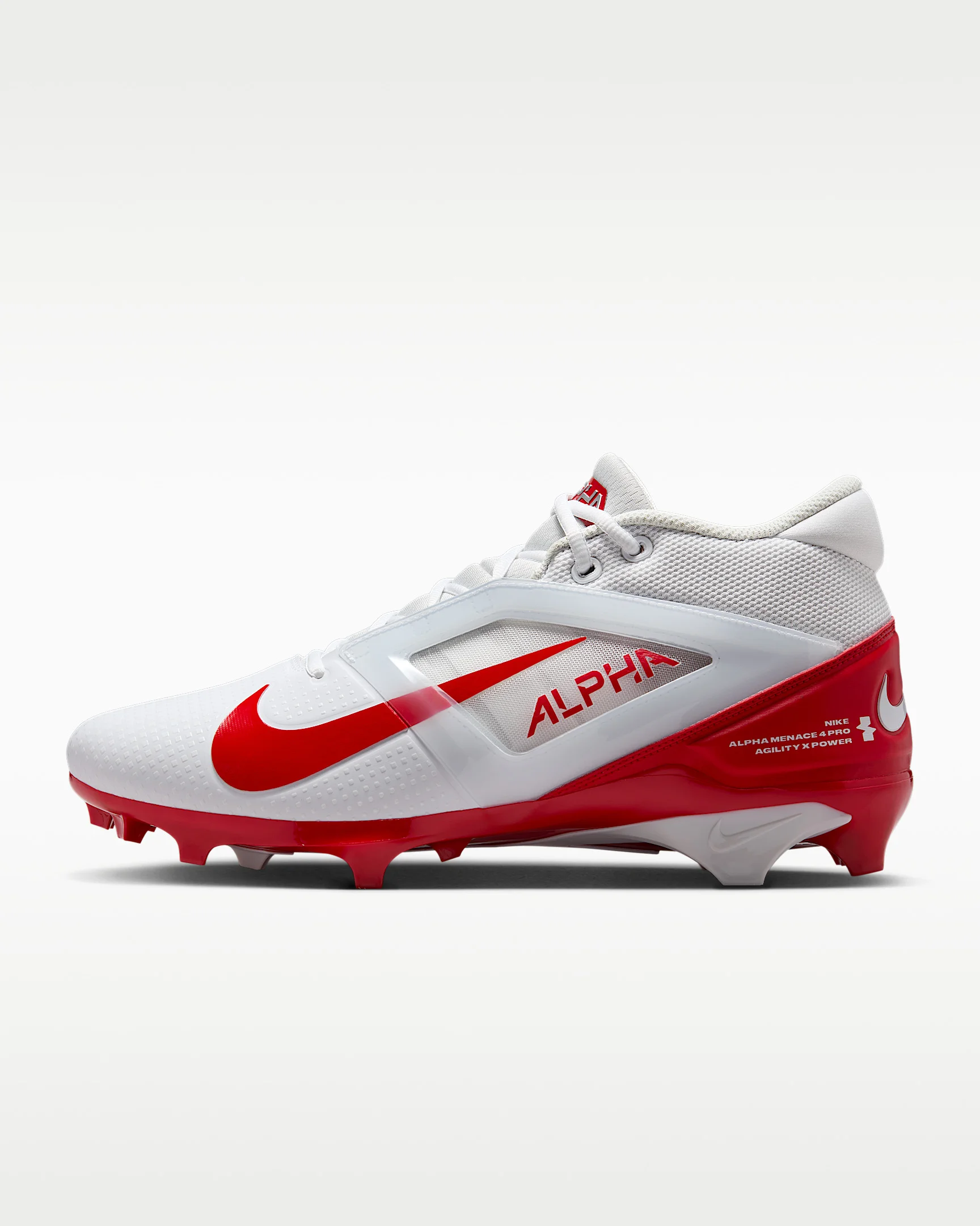 Whether you’re toting the rock or speeding by your defender, the Alpha Menace Pro 4 is primed for playmaking and pad pops. Better durability and breathability throughout the upper compared to the previous iteration complement a cleat capable of suddenness, stuffs and stands when it counts most. Product Details - Shown: White/University Red/Photon Dust/University Red - Style: FD7037-102
