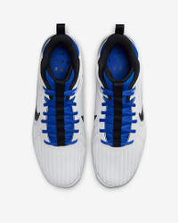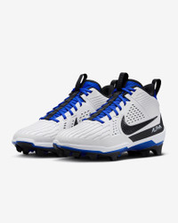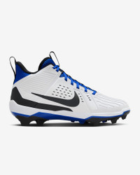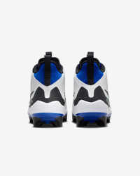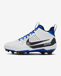 The Alpha Menace Strong offers ideal traction in the trenches, regardless of weather or wayward field conditions. An all-new Alpha plate made of mixed sticky rubber combines with soft foam to help unleash your wrath at the snap or wherever there is ground to be staked. Benefits - New Alpha plate is made of mixed sticky rubber in the forefoot and heel for extra traction. - Rubber overlays in the forefoot, specifically the toes, offer support. Product Details - Synthetic leather on upper - Mesh collar and tongue for breathability - Foam midsole - Shown: White/Hyper Royal/Dark Smoke Grey/Black - Style: II5139-101
