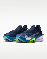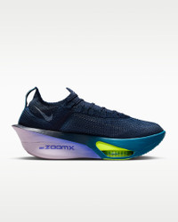 Fine-tuned for marathon speed, the Alphafly 3 helps push you beyond what you thought possible. Three innovative technologies power your run: A double dose of Air Zoom units helps launch you into your next step; a full-length carbon fiber plate helps propel you forward with ease; and a heel-to-toe ZoomX foam midsole helps keep you fresh from start to 26.2. Time to leave your old personal records in the dust. More Benefits - Notched laces offer a secure but soft lace-up. - Integrated knit tongue with lofted padding helps alleviate lace pressure. Product Details - Weight: Approx. 218g/7.7oz (Men's US 10) - Heel-to-toe drop: 8mm - Not intended for use as Personal Protective Equipment (PPE) - Shown: Obsidian/Doll/Persian Violet/White - Style: FD8311-401