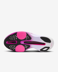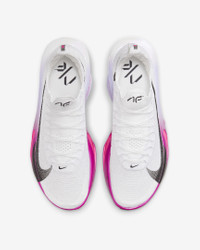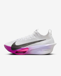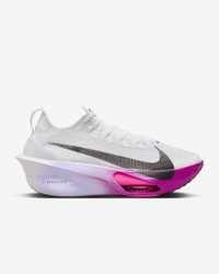 Fine-tuned for marathon speed, the Alphafly 3 helps push you beyond what you thought possible. Three innovative technologies power your run: A double dose of Air Zoom units helps launch you into your next step; a full-length carbon fiber plate helps propel you forward with ease; and a heel-to-toe ZoomX foam midsole helps keep you fresh from start to 26.2. Time to leave your old personal records in the dust. More Benefits - Notched laces offer a secure but soft lace-up. - Integrated knit tongue with lofted padding helps alleviate lace pressure. Product Details - Weight: Approx. 218g/7.6oz (Men's US 10) - Heel-to-toe drop: 8mm - Shown: White/Purple Agate/Vivid Grape/Black - Style: FD8311-100