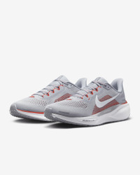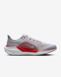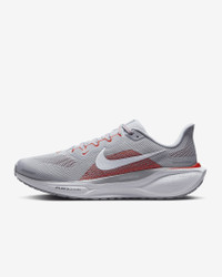 Responsive cushioning in the Pegasus provides an energized ride for everyday road running. Experience lighter-weight energy return with dual Air Zoom units and a ReactX foam midsole. Plus, improved engineered mesh on the upper decreases weight and increases breathability. Benefits - Upgraded breathable engineered mesh upper - ReactX foam midsole surrounds forefoot and heel Air Zoom units for an energized ride. - Signature waffle-inspired rubber outsole for traction and flexibility - Plush collar tongue and sockliner for a secure and comfortable fit - What's new? All-new ReactX foam midsole is 13% more responsive than previous React technology. - Crafted for performance and planet, ReactX foam is engineered to reduce its carbon footprint by at least 43% in a pair of midsoles due to reduced manufacturing process energy compared to prior React foam. The carbon footprint of ReactX is based on cradle-to-gate assessment reviewed by PRe Sustainability B.V and Intertek China. Other midsole components such as airbags, plates or other foam formulations were not considered. Product Details - Weight: Approx. 297 g/10.4 oz (Men's US 10) - Heel-to-toe drop: 10 mm - MR-10 Last - Our best, most consistent fit (same as Pegasus 40) - Reflective details - Not intended for use as Personal Protective Equipment (PPE) - Shown: Wolf Grey/White/Team Crimson/White - Style: FZ5105-001