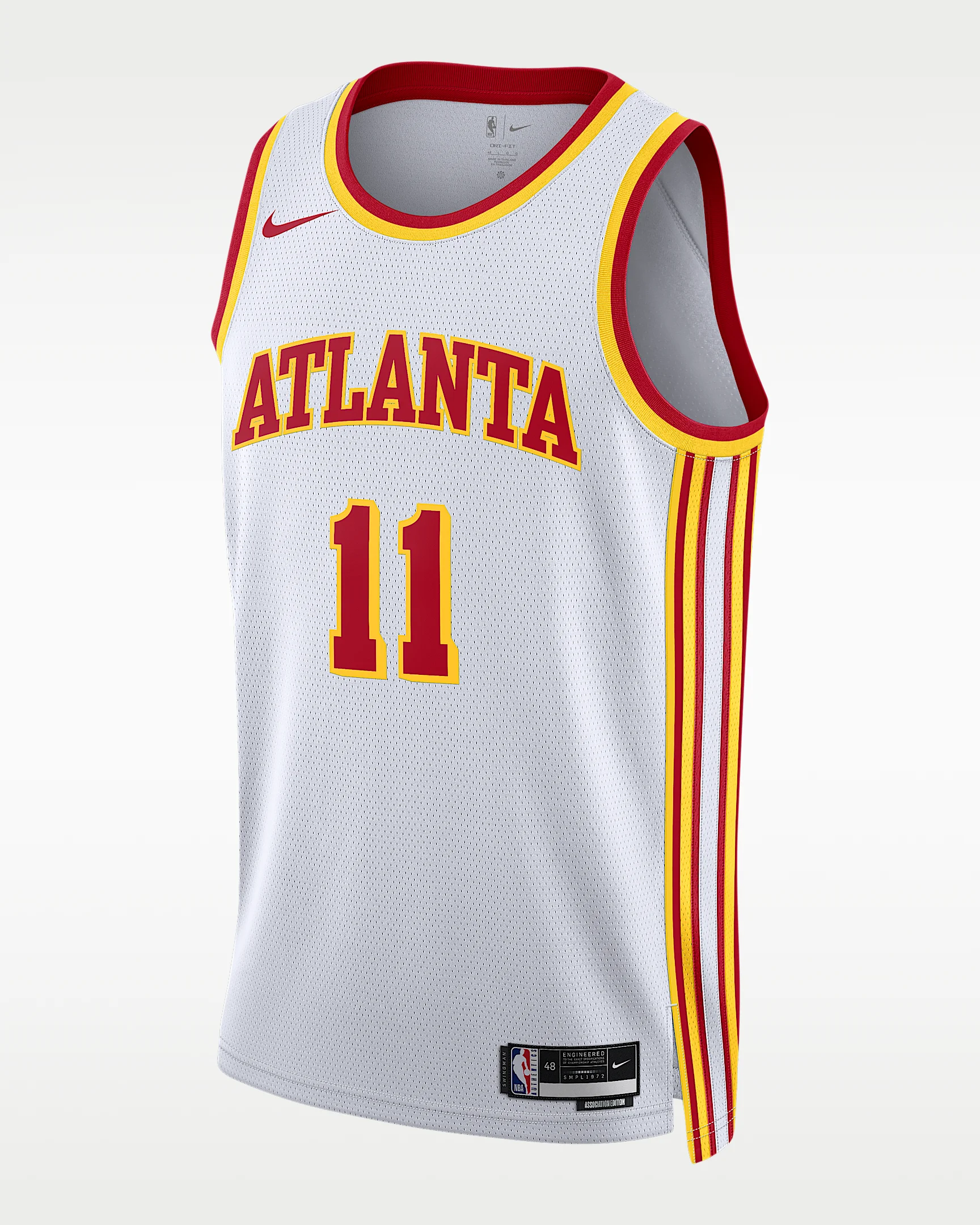 With a white background, the Association Edition Jersey is a common thread shared by every team in the NBA. This Atlanta Hawks jersey is inspired by what the pros wear on the hardwood, from team colors and graphics to lightweight, sweat-wicking mesh. It helps keep you dry and cool on or off the court while you rep your favorite player and the game you love. Benefits - Nike Dri-FIT technology moves sweat away from your skin for quicker evaporation, helping you stay dry and comfortable. - Breathable mesh helps keep you cool on or off the court. Product Details - Woven jock tag at hem - 100% polyester - Machine wash - Imported - Shown: White - Style: DN2068-100 SIZE & FIT Standard fit: easy and traditional If you typically wear men's styles, please select your usual size. If you typically wear women's styles, please size down.