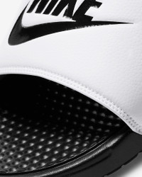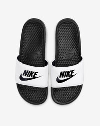 Slide into comfort in the lightweight and sporty Nike Benassi JDI Slide. It features the Nike logo on the foot strap, which is lined in super soft fabric. The foam midsole brings that beach feeling to your feet and adds spring to your kicked-back style. Benefits - 1-piece, synthetic leather strap is lined with super soft, towel-like fabric. - The foam midsole doubles as an outsole, adding lightweight cushioning. - Flex grooves let you move comfortably. Product Details - Shown: White/Black/Black - Style: 343880-100