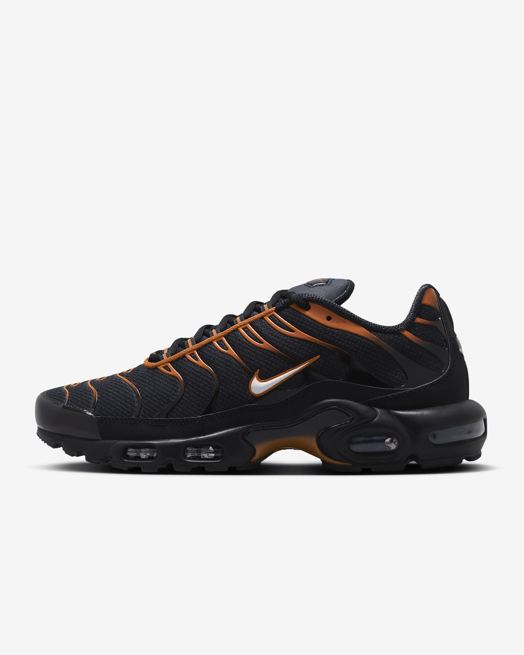 Let your attitude have the edge with flame-like caging that adds heat to the streets while airy mesh keeps you cool. The Air Max Plus gives you a tuned Nike Air experience that offers premium stability and unbelievable cushioning. Benefits - Synthetic upper with lightweight mesh adds breathability and durability. - Plastic cage and midfoot arch provide a supportive feel. - Originally designed for performance running, Nike Air units provide lightweight cushioning that lasts. - Rubber outsole gives you durable traction. Product Details - Not intended for use as Personal Protective Equipment (PPE) - Shown: Dark Obsidian/Monarch/Black/White - Style: FN6949-400