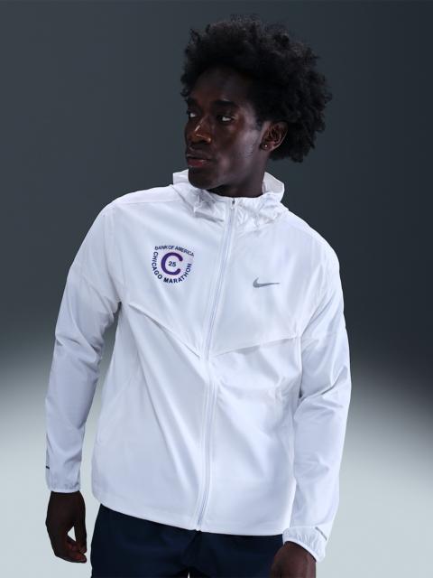 This ultralight jacket celebrates the Bank of America Chicago Marathon. It’s built for unpredictable weather, with a lightweight, water-repellent design that packs away when the skies clear. More Benefits - Mesh panels under the arms provide extra breathability. - Zippered pockets allow you to securely store essentials. Product Details - Full-length zipper - Hood with a bungee cord - Reflective Swoosh - Reflective elements - Body: 93% polyester/ 7% spandex. Mesh: 100% polyester. - Machine wash - Imported - Not intended for use as Personal Protective Equipment (PPE) - Shown: Black/Light Current Blue - Style: HQ4267-010 SIZE & FIT Model is wearing size M and is 6′0″183cm Standard fit: easy and traditional