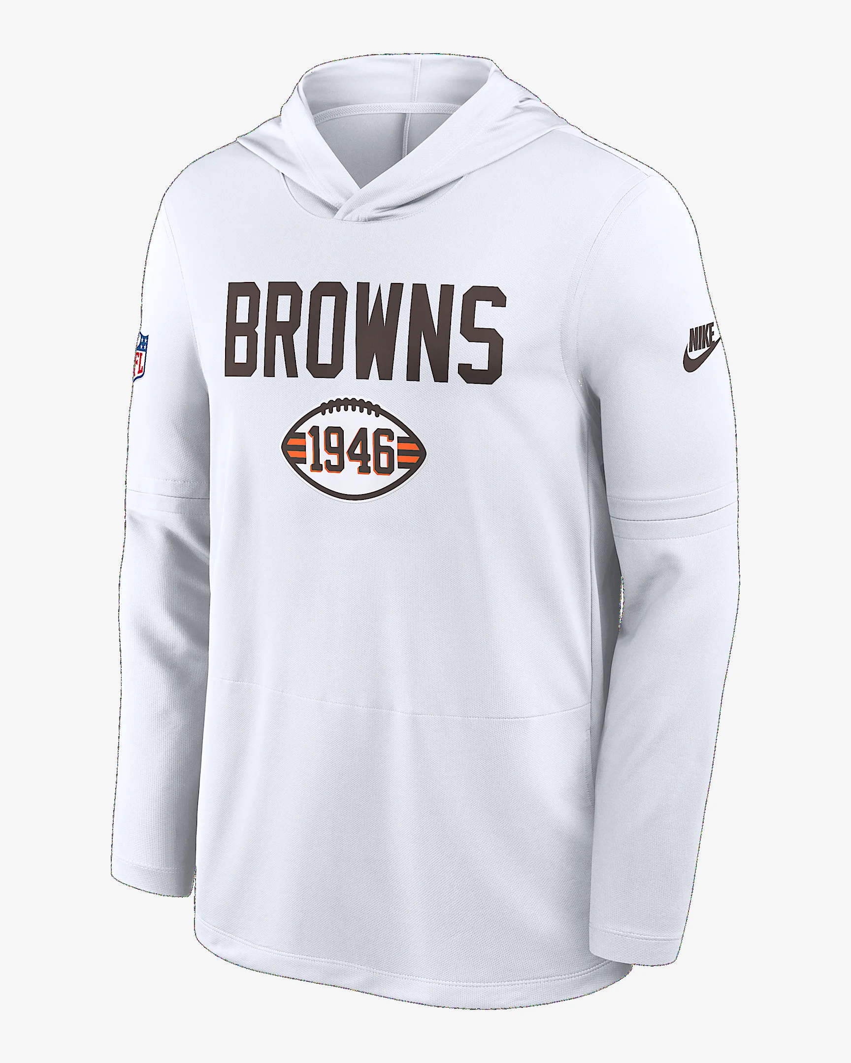 Perfect for lightweight coverage, the Pass Accuracy Top helps you comfortably support the Cleveland Browns. It features sweat-wicking technology for ultimate comfort. Benefits - Nike Dri-FIT technology moves sweat away from your skin for quicker evaporation, helping you stay dry and comfortable. - Rounded drop-tail hem helps provide proper coverage. Product Details - Hood without drawstring - 100% recycled polyester - Machine wash - Imported - Shown: White - Style: 03B910AQ93-D60