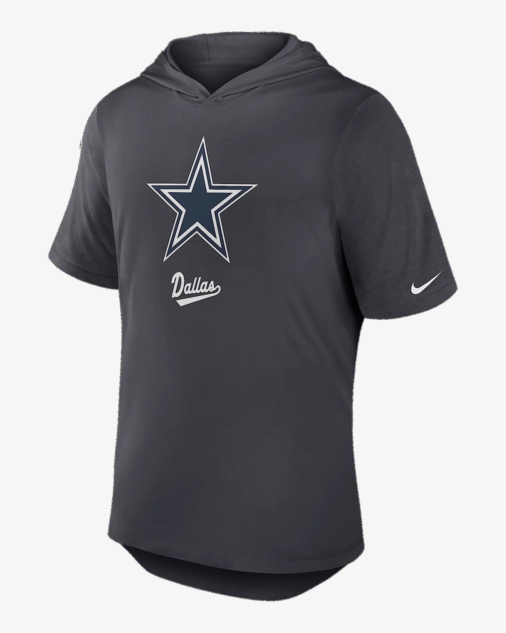 This Dallas Cowboys T-Shirt combines soft, lightweight tri-blend material with sweat-wicking technology to help keep you dry and comfortable. Its contrast-color sleeves accentuate the team graphics across the chest. Benefits - Nike Dri-FIT technology moves sweat away from your skin for quicker evaporation, helping you stay dry and comfortable. - Jersey fabric has a soft, lightweight feel. Product Details - Hood without drawstring - Rounded drop-tail hem - 75% recycled polyester/13% rayon/12% cotton - Machine wash - Imported - Shown: Anthracite - Style: 03NB06F7RD-2B7