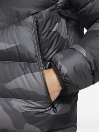 down-fill camouflage puffer jacket Highlights - Dark grey and black - Camouflage print - Hooded neckline - Front zip fastening - Chevron quilting - Front welt pockets Imported Composition Fabric 100% Washing instructions Read Manufacturer Guidelines