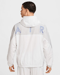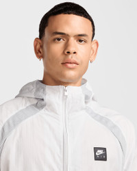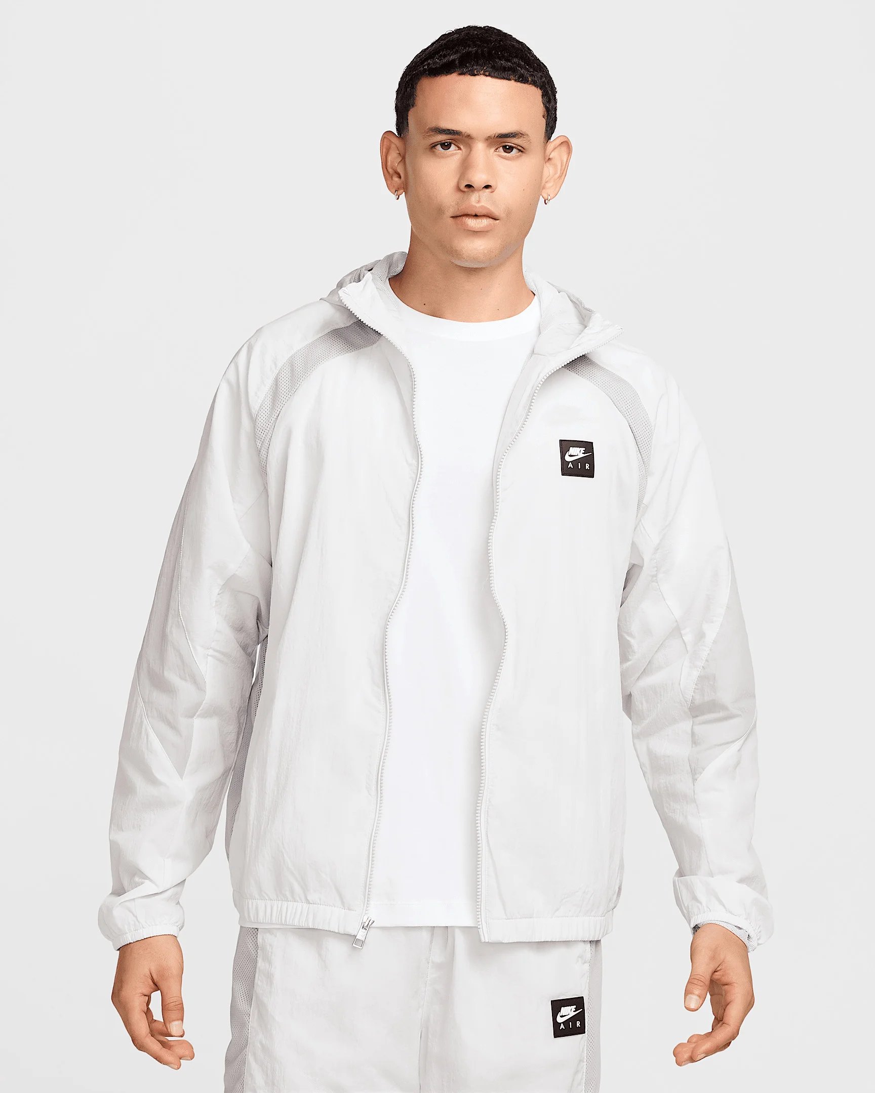 Dial up your casual attire with this premium track jacket. Its roomy fit is crafted with a thick, water-repellent woven material. The mesh overlay panels ground the look in sport. Benefits - Designed to feel roomy through the body for easy movement and layering. - The hood features a mesh lining and bungee system to adjust your fit. Product Details - Large "Air" logo on the back and silicone "Nike Air" patch graphic - Body: 100% nylon. Mesh: 100% polyester. Lining: 100% polyester. - Machine wash - Imported - Shown: Photon Dust/Light Smoke Grey/Black - Style: HJ0634-009 SIZE & FIT Model is wearing size M and is 6′1″185cm Loose fit: roomy and relaxed