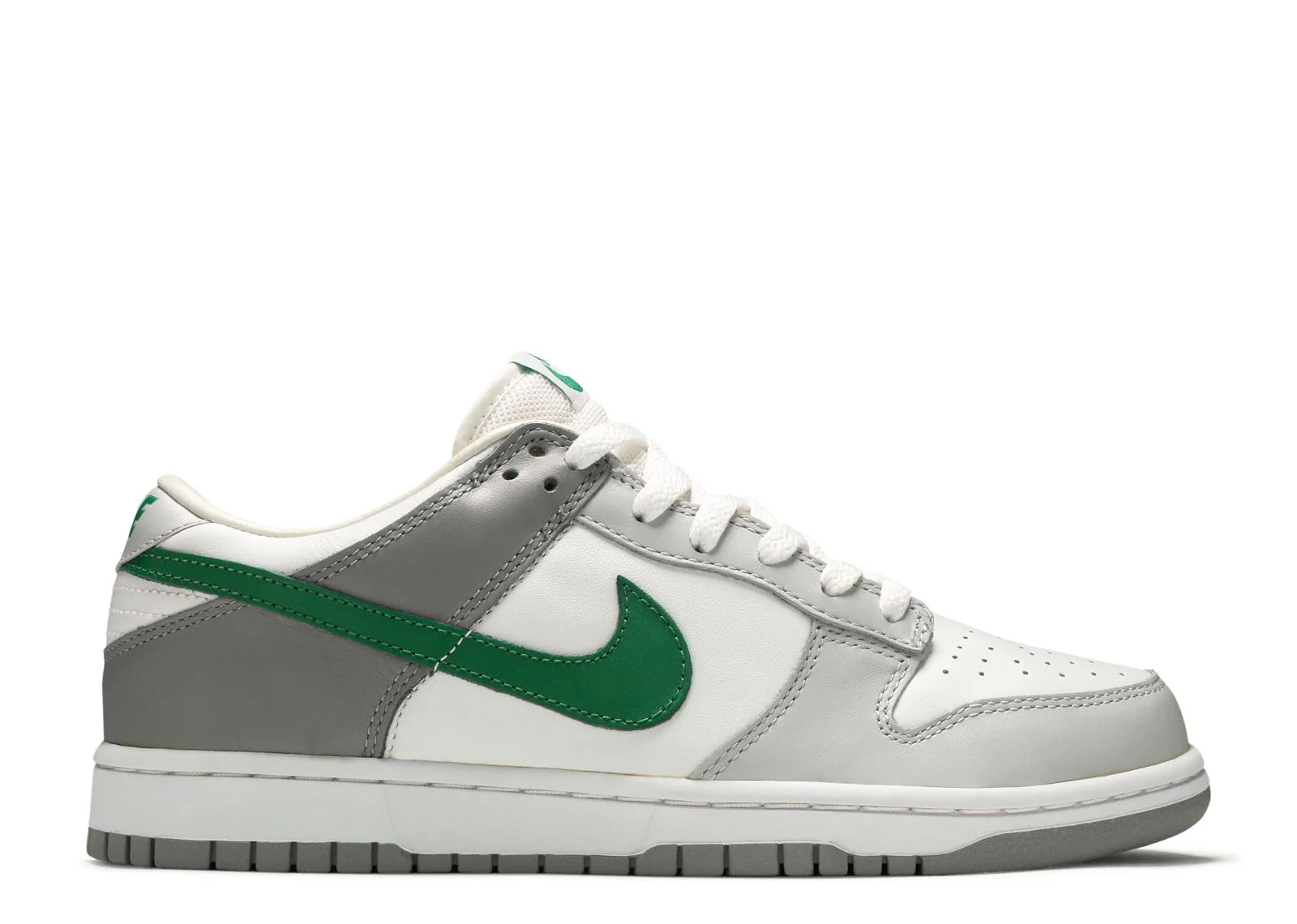 In 1985, the same year that the Air Jordan 1 was released, Nike launched the Dunk as part of an extensive expansion to their basketball division. Originally known as the 'College Color High,' the shoe was released in numerous colorways that drew inspiration from various team colors. The Nike Dunk Low version of the shoe features a Neutral and Medium Grey, Classic Green, and white color scheme. Support is provided by a foam-enhanced cupsole and the outsole is designed with a pivot-point pattern for excellent grip and traction underfoot. SKU: 624044 131 Colorway: white/classic green-neutral grey-medium grey