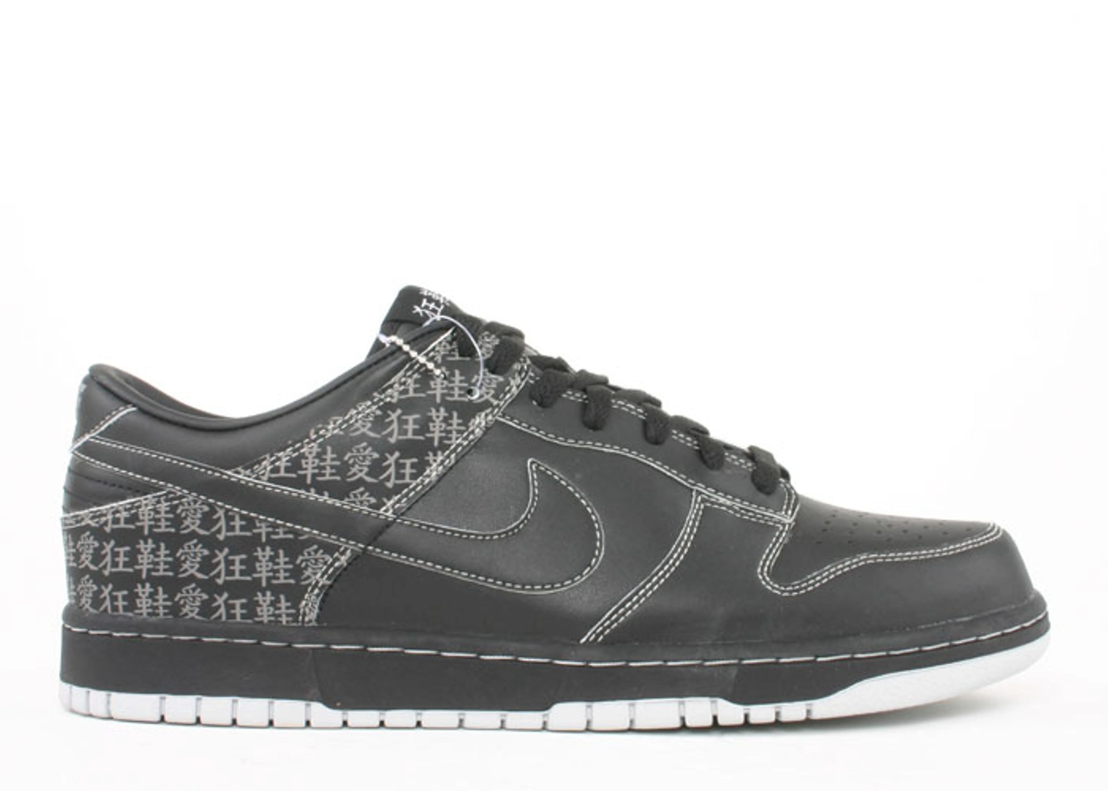 Also known as the 'Sneakerholic,' this Dunk Low was released primarily in Asia. The shoe's black leather upper is accented by metallic silver Chinese characters on the heel overlay, tongue branding and outsole. The look is matched by the contrast stitching, while the white outsole adds further contrast. Zoom Air is included for cushioning. SKU: 309431 009 Colorway: Black/Black-Metallic Silver Release Date: 1/1/05