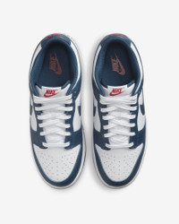 Created for the hardwood but taken to the streets, the Nike Dunk Low Retro returns with crisp overlays and original team colors. This basketball icon channels '80s vibes with premium leather in the upper that looks good and breaks in even better. Modern footwear technology helps bring the comfort into the 21st century. Benefits - Premium leather in the upper has the perfect sheen and breaks in beautifully. - The modern foam midsole offers lightweight, responsive cushioning. - A padded, low-cut collar adds a sleek look that feels comfortable. - Bold color blocking throws it back to the original colorway inspiration: school team colors. - The rubber outsole with classic hoops pivot circle adds durability, traction and heritage style. Product Details - Low-cut collar - Foam insole - Perforations on toe - Shown: Valerian Blue/White/University Red/Valerian Blue - Style: DD1391-400