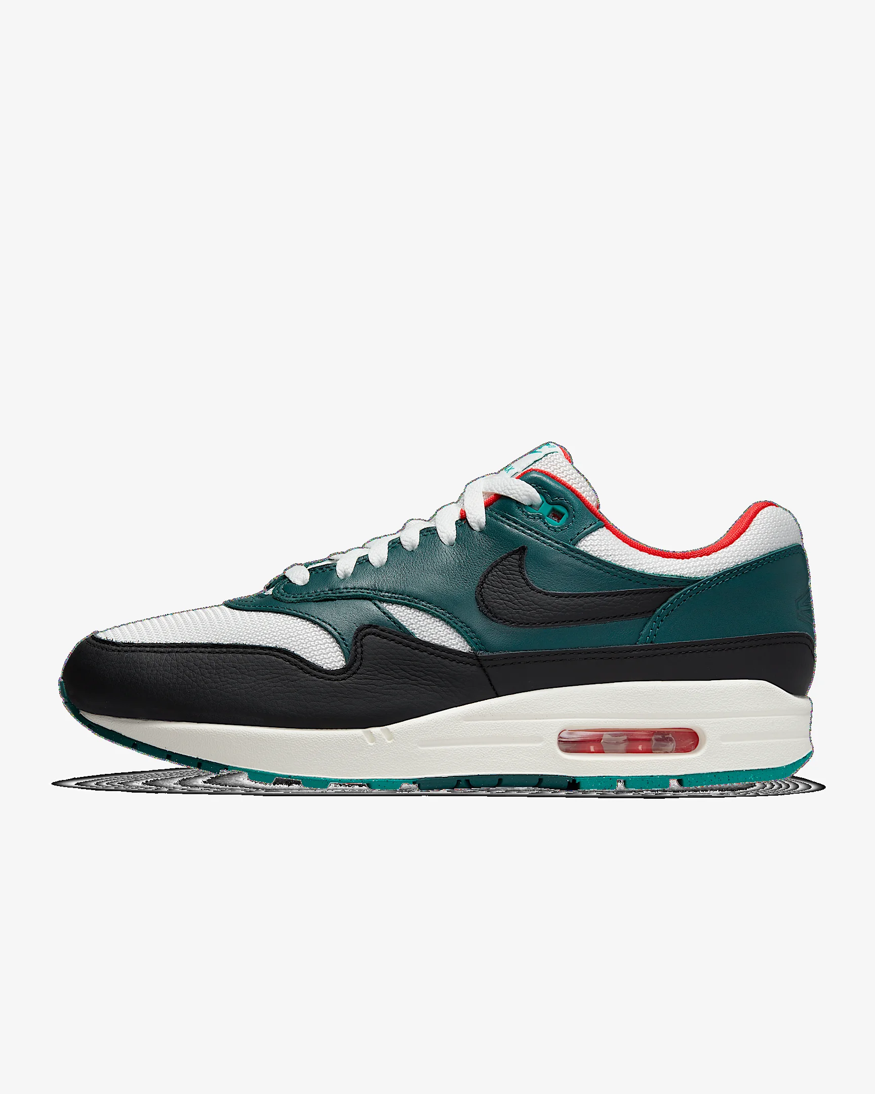 LeBron & Liverpool to the world. Celebrate your passion for the pitch in this fresh take on the Air Max 1. Vibrant Liverpool FC colors and striking visuals like the club's crest honor the King's favorite squad. Plus, crafted branding on the heels and a rich mixture of leather and textile give the shoe that revealed Air to the world a premium boost. The perfect pair for those who travel far and wide with brandishing banners, booming voices and unwavering pride—lace up and excite the streets with this flashy new addition to your kit. Benefits - Leather and textile upper creates a durable, layered look. - Plush and comfortable, Max Air cushioning has just the right amount of support. - Rubber outsole adds traction and durability. - Padded, low-cut collar feels soft and comfortable. Product Details - Shown: Summit White/Dark Atomic Teal/Sail/Black - Style: FB8914-100
